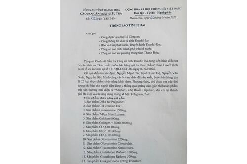 Thông báo tìm bị hại trong vụ án sản xuất, buôn bán thực phẩm chức năng giả -