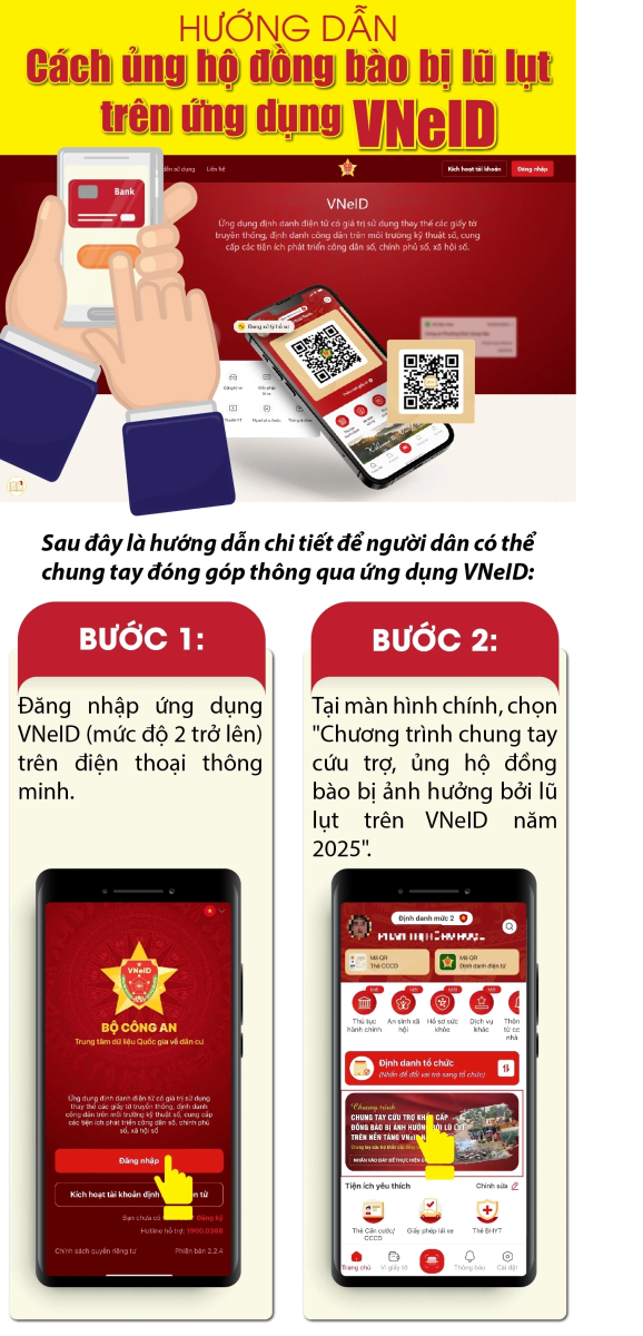 Hiện nay, nhiều địa phương trên cả nước vẫn đang oằn mình trước bão lũ, ngập úng khiến cuộc sống của người dân gặp rất nhiều khó khăn. Nhằm kịp thời chung tay hỗ trợ đồng bào khắc phục hậu quả thiên tai và sớm ổn định cuộc sống, người dân có thể trực tiếp đóng góp ủng hộ các khu vực bị ảnh hưởng ngay trên ứng dụng VNeID. Sau đây là hướng dẫn chi tiết để người dân có thể chung tay đóng góp thông qua ứng dụng VNeID:
