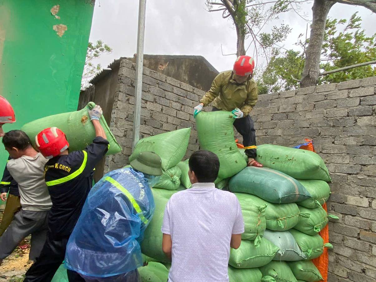 Không chỉ cứu người, các chiến sĩ PCCC và CNCH còn giúp dân bảo vệ tài sản. Tại xã Hoằng Phú, mái nhà ông Lê Đình Trung bị tốc hoàn toàn, mưa lớn khiến 5 tấn lúa mới thu hoạch có nguy cơ mất trắng. Ngay lập tức, lực lượng CNCH đã cùng người dân khẩn trương di chuyển toàn bộ lúa đến khu vực có mái che an toàn, hạn chế tối đa thiệt hại.