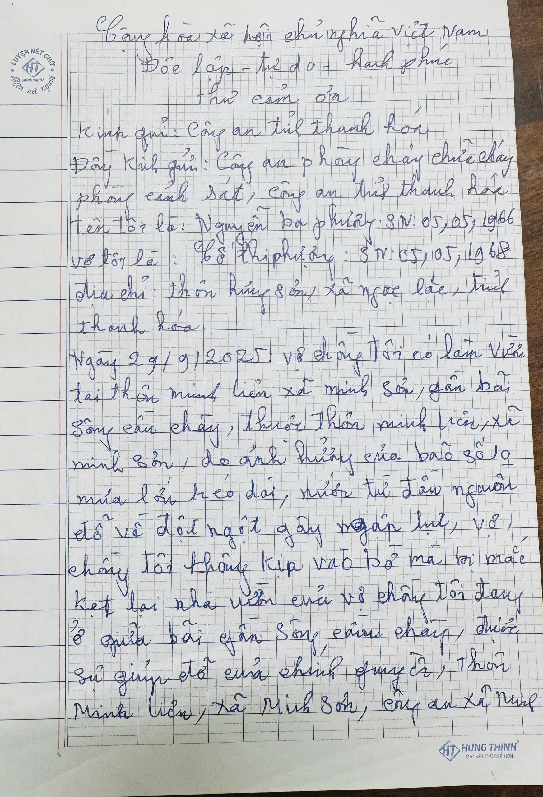Mới đây, vợ chồng ông Nguyễn Bá Phương (trú tại xã Ngọc Lặc, tỉnh Thanh Hóa) đã gửi bức thư cảm ơn chân thành đến lực lượng Cảnh sát Cảnh sát PCCC và CNCH, công an xã, chính quyền địa phương, những người đã kịp thời ứng cứu, đưa ông bà thoát khỏi vùng nguy hiểm trong đợt lũ dữ xảy ra tại xã Minh Sơn đợt cuối tháng 9 vừa qua.