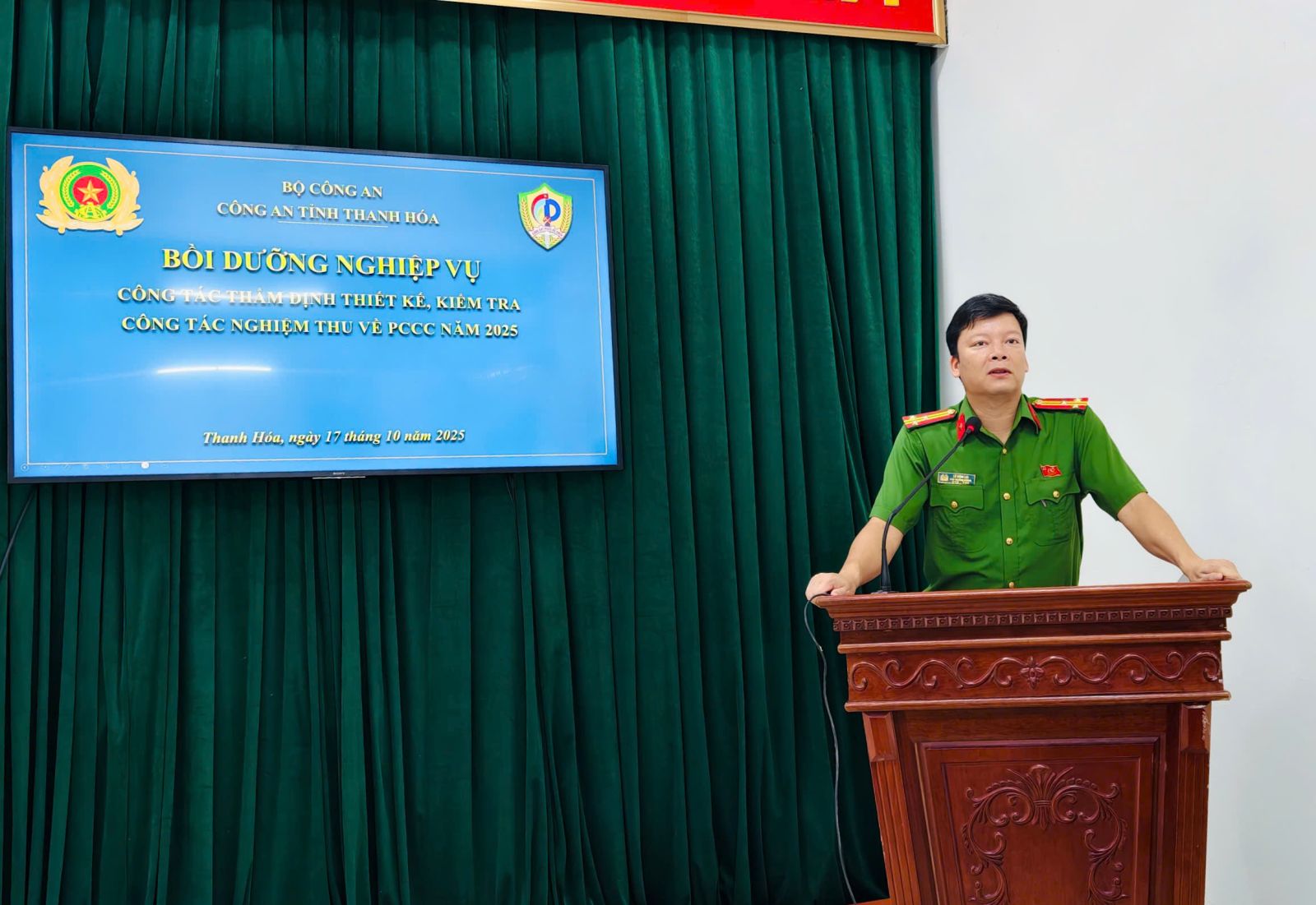 Để tiếp tục nâng cao năng lực, trình độ chuyên môn nghiệp vụ cho cán bộ, chiến sỹ làm công tác thẩm duyệt, thiết kế về PCCC và CNCH. Ngày 17/10/2025, Phòng Cảnh sát PCCC và CNCH, Công an tỉnh Thanh Hóa tổ chức lớp bồi dưỡng công tác thẩm định thiết kế, kiểm tra công tác nghiệm thu về phòng cháy, chữa cháy cho 86 cán bộ, chiến sỹ trực tiếp thực hiện hoặc dự kiến phân công thực hiện nhiệm vụ trong đơn vị.