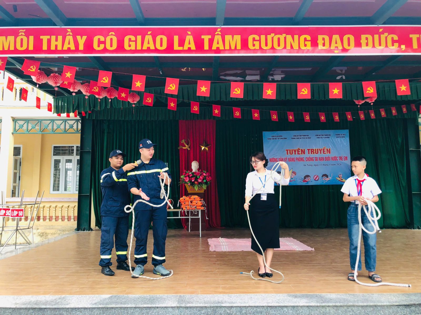 Ngày 14/4/2026, Đội Chữa cháy và CNCH khu vực 9, Phòng Cảnh sát PCCC và CNCH, Công an tỉnh Thanh Hóa phối hợp Trung tâm học tập cộng đồng xã An Nông và xã Đồng Tiến tổ chức chương trình tuyên truyền, phổ biến kiến thức, kỹ năng phòng, chống tai nạn đuối nước cho học sinh và giáo viên Trường TH, THCS Khuyến Nông và Trường Tiểu học Đồng Tiến với sự tham gia của khoảng 1.800 cán bộ giáo viên, học sinh.