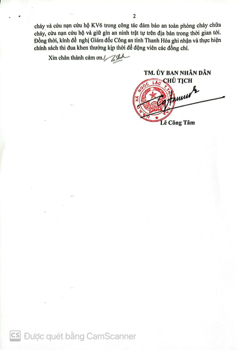 UBND xã Ngọc Lặc bày tỏ sự cảm ơn chân thành, sâu sắc và đề nghị Giám đốc Công an tỉnh Thanh Hóa ghi nhận, có hình thức khen thưởng kịp thời để động viên cán bộ, chiến sỹ trực tiếp tham gia cứu nạn, cứu hộ trong đợt mưa lũ lần này.
