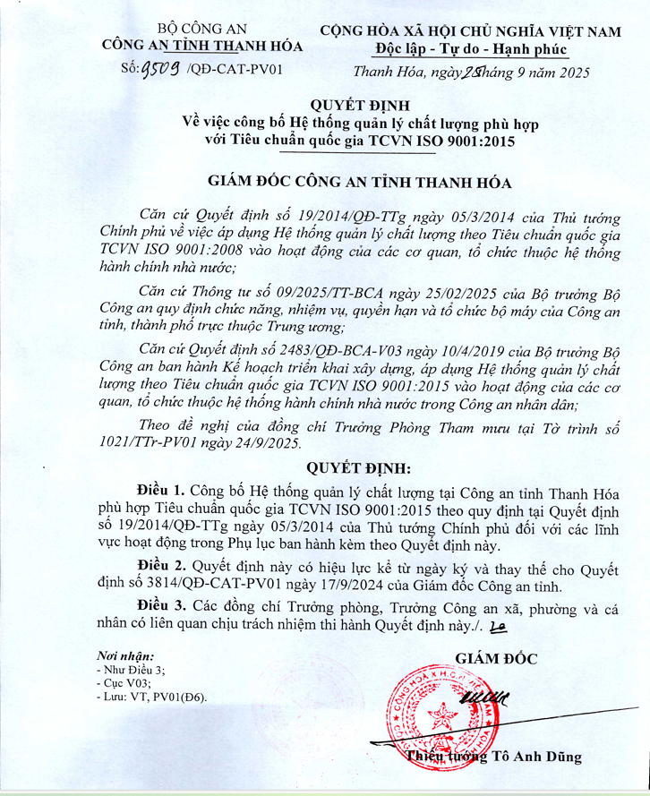 Quyết định về việc công bố Hệ thống quản lý chất lượng phù hợp với Tiêu chuẩn quốc gia TCVN ISO 9001:2015