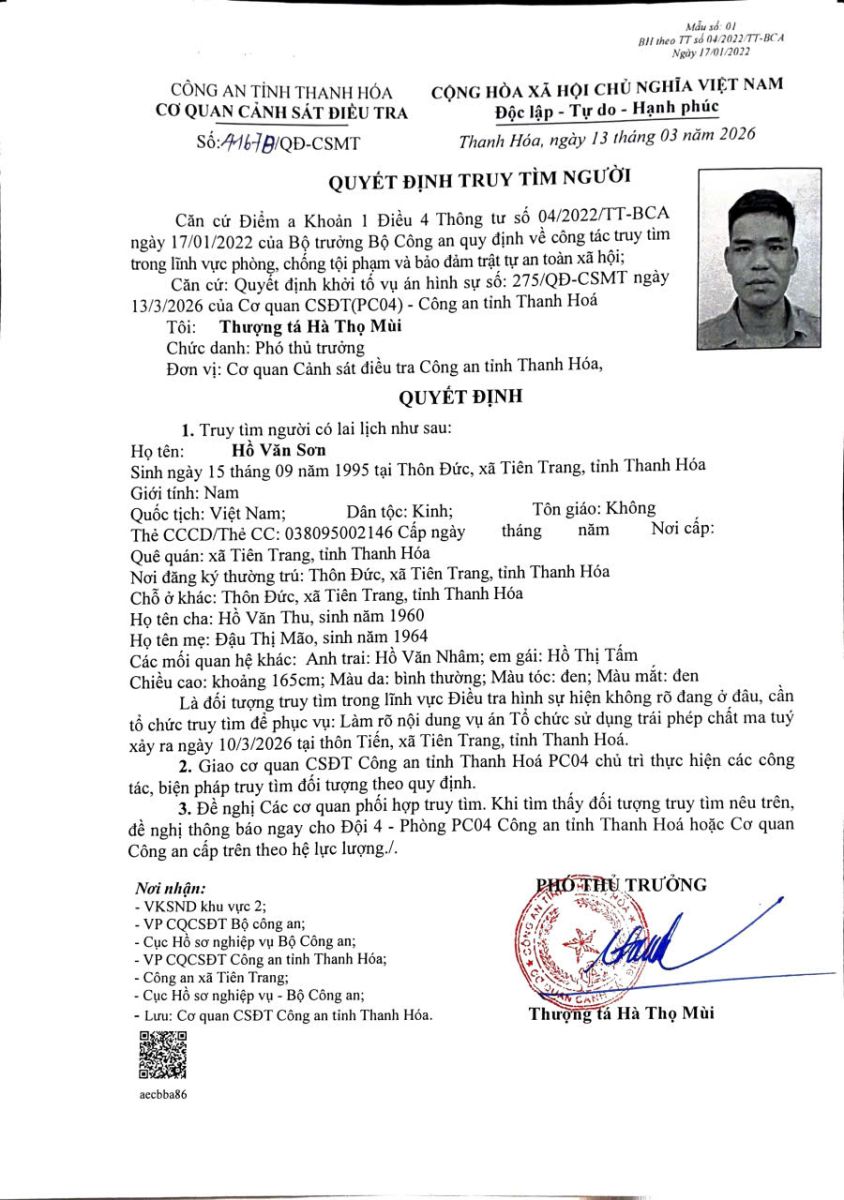 Quyết định truy tìm người số 4167B/QĐ-CSMT ngày 13/3/2026 của Cơ quan CSĐT(PC04) Công an tỉnh Thanh Hóa