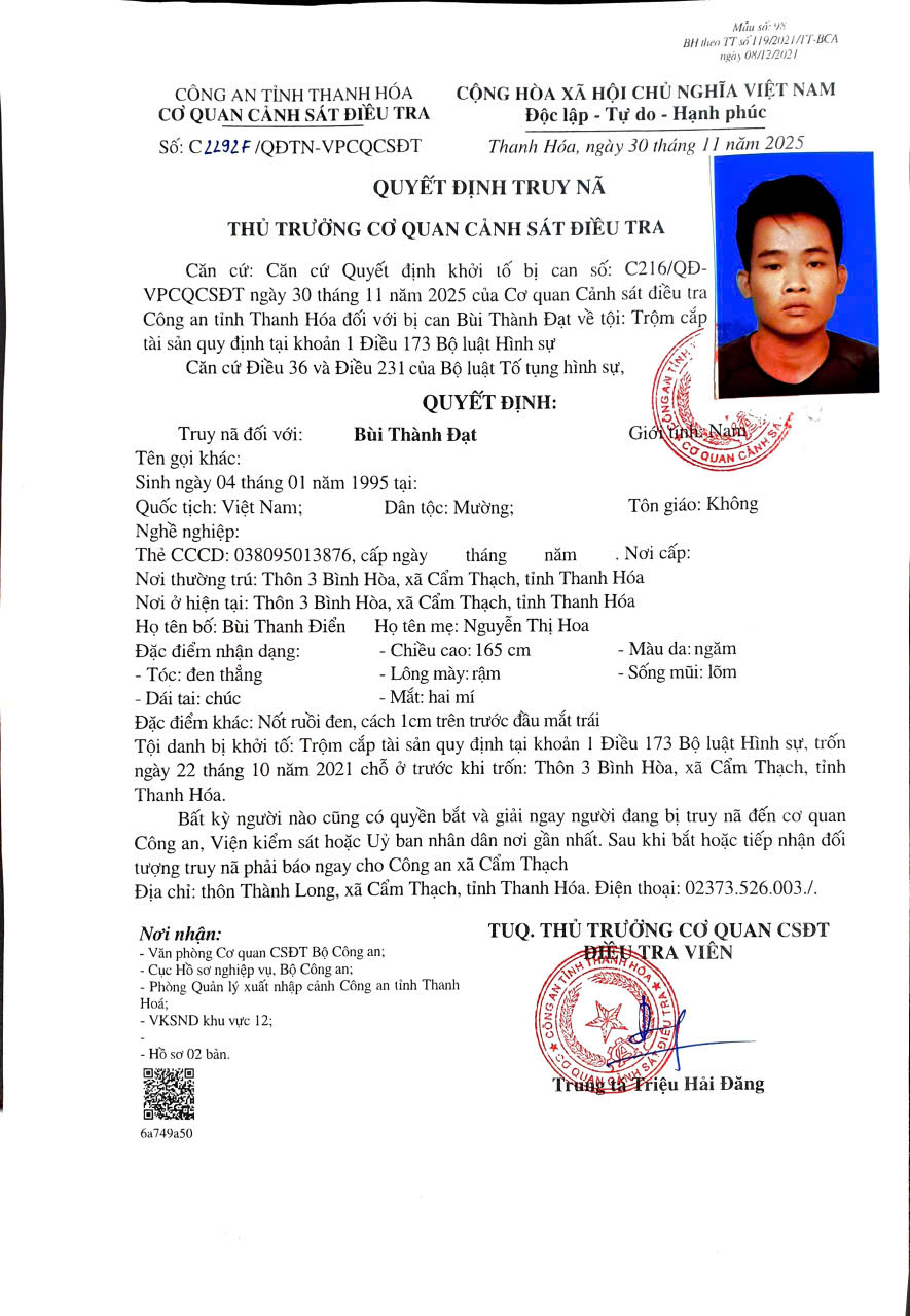 Quyết định truy nã số: C2292F/QĐTN-VPCQCSĐT