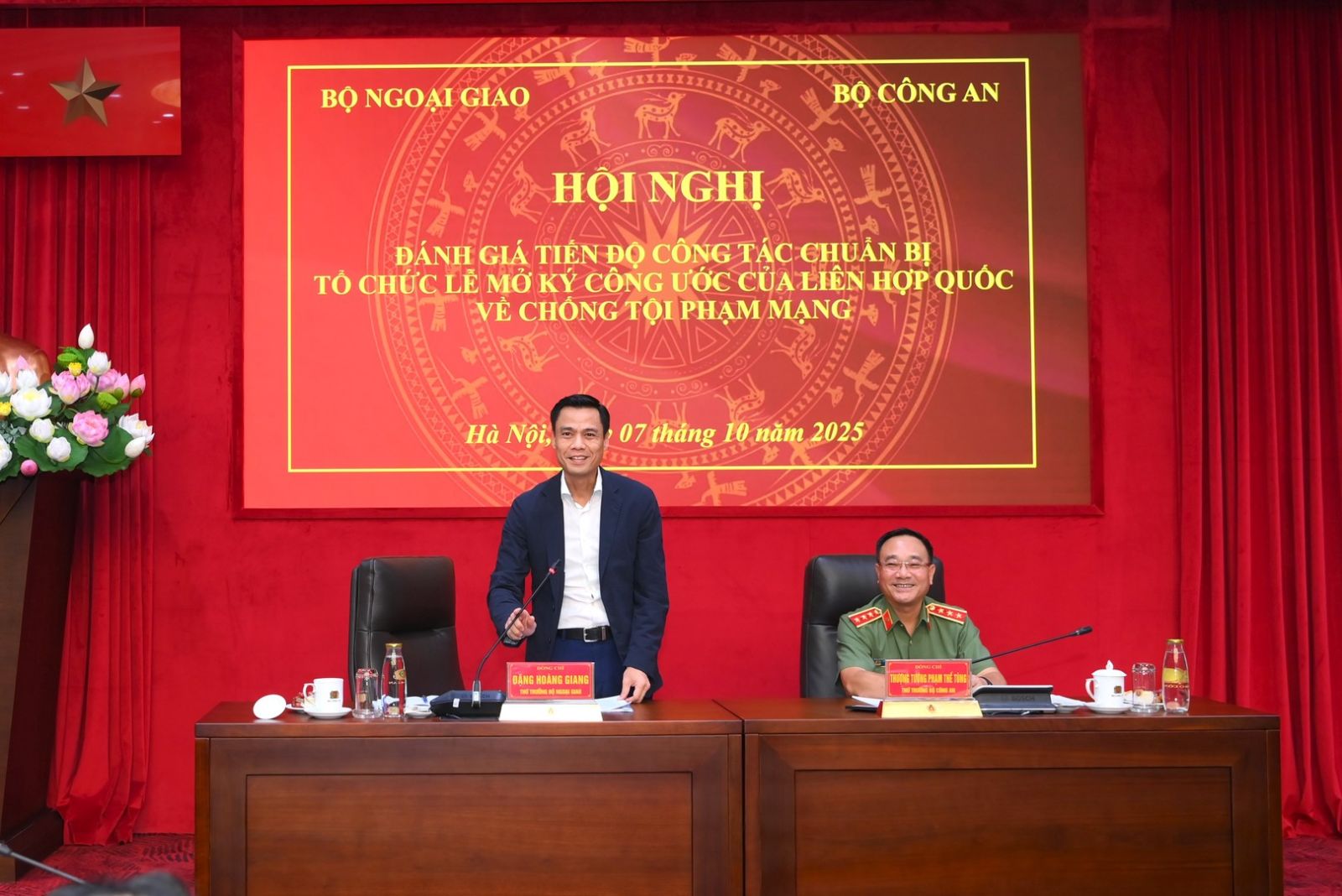 Chiều 07/10/2025, tại Hà Nội, Thượng tướng Phạm Thế Tùng, Thứ trưởng Bộ Công an, Trưởng Ban Chỉ đạo công tác chuẩn bị tổ chức Lễ mở ký Công ước của Liên hợp quốc về chống tội phạm mạng (Lễ mở ký Công ước) và đồng chí Đặng Hoàng Giang, Thứ trưởng Bộ Ngoại giao đồng chủ trì Hội nghị đánh giá tiến độ công tác chuẩn bị tổ chức Lễ mở ký Công ước.
