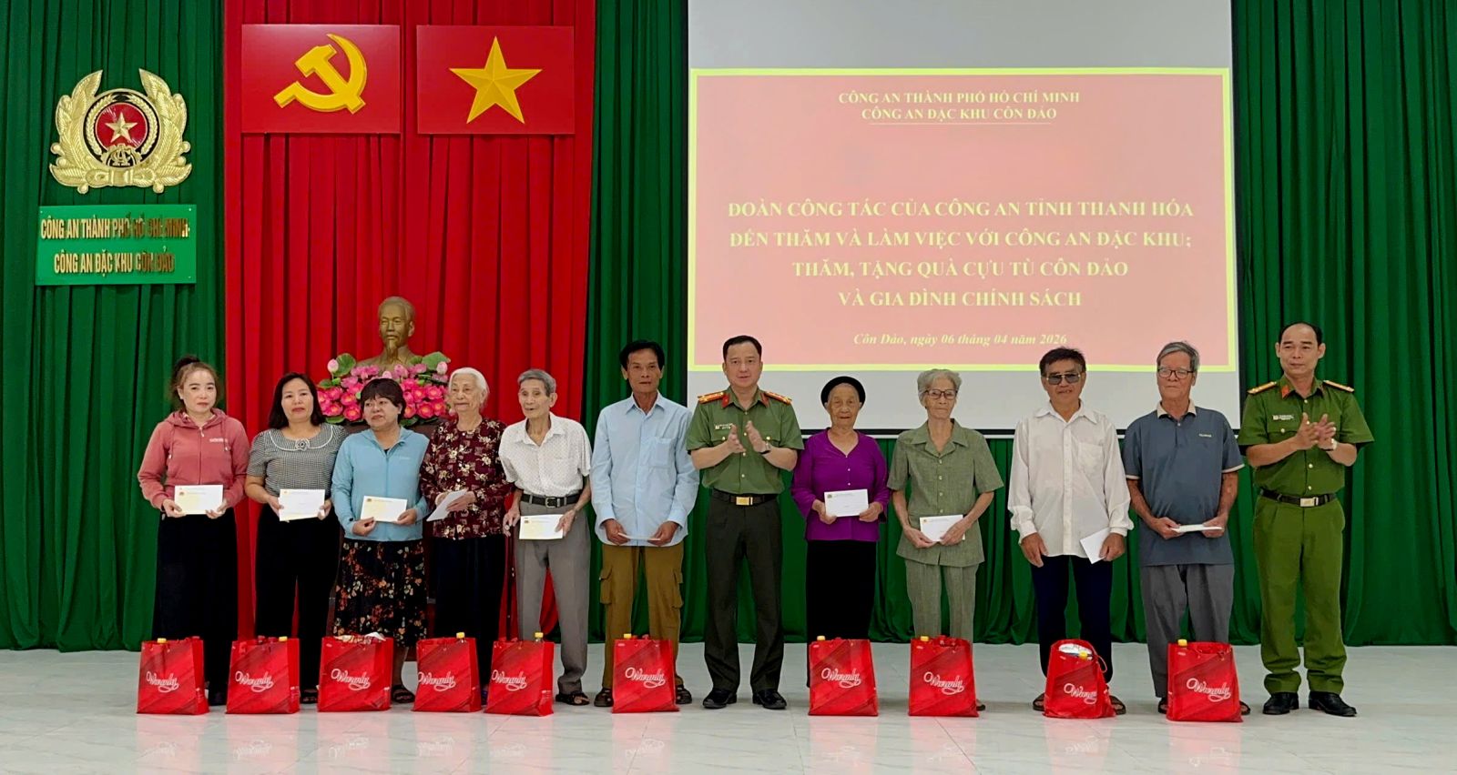 Rời không gian tưởng niệm, Đoàn công tác tiếp tục hành trình về nguồn bằng những hoạt động nghĩa tình, thiết thực. Trong chương trình thăm, làm việc với cán bộ, chiến sĩ Công an đặc khu Côn Đảo và gặp gỡ các cựu tù Côn Đảo, các gia đình chính sách, Đoàn đã trao tặng 1 bộ máy vi tính trị giá 15 triệu đồng cho lực lượng Công an đặc khu; đồng thời trao 10 suất quà, mỗi suất trị giá 6,5 triệu đồng tới các đối tượng chính sách và cựu tù chính trị trên địa bàn. Những phần quà tuy không lớn về vật chất nhưng chứa đựng tình cảm sâu nặng, là sự tri ân chân thành đối với những cống hiến, hy sinh của các thế hệ đi trước.