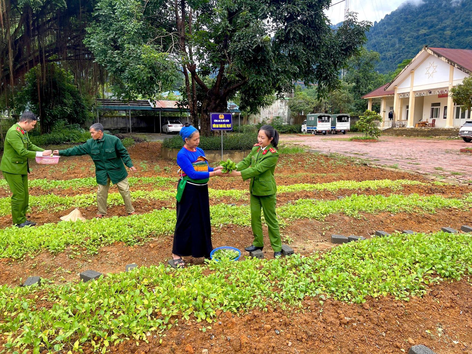 Cán bộ, chiến sĩ Công an xã Hồi Xuân tặng rau sạch cho người dân địa phương