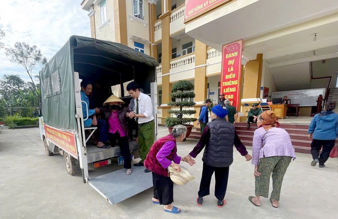 Công an xã sử dụng xe ô tô chuyên dụng đưa đón người cao tuổi đến trụ sở để thu nhận Căn cước và đăng ký định danh điện tử