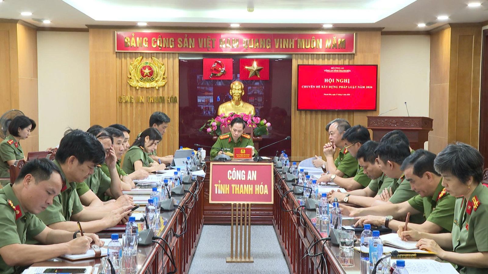 Hội nghị được tổ chức theo hình thức trực tiếp tại Hội trường Bộ Công an (Hà Nội) kết hợp trực tuyến đến điểm cầu Công an các đơn vị địa phương. Tại điểm cầu Công an tỉnh Thanh Hoá, đồng chí Đại tá Trịnh Văn Giang, Phó Giám đốc Công an tỉnh dự và chủ trì Hội nghị. Tham dự Hội nghị có đại diện lãnh đạo các phòng nghiệp vụ Công an tỉnh; đại diện chỉ huy, cán bộ theo dõi chuyên đề Đội Pháp chế và quản lý khoa học, Phòng Tham mưu Công an tỉnh.