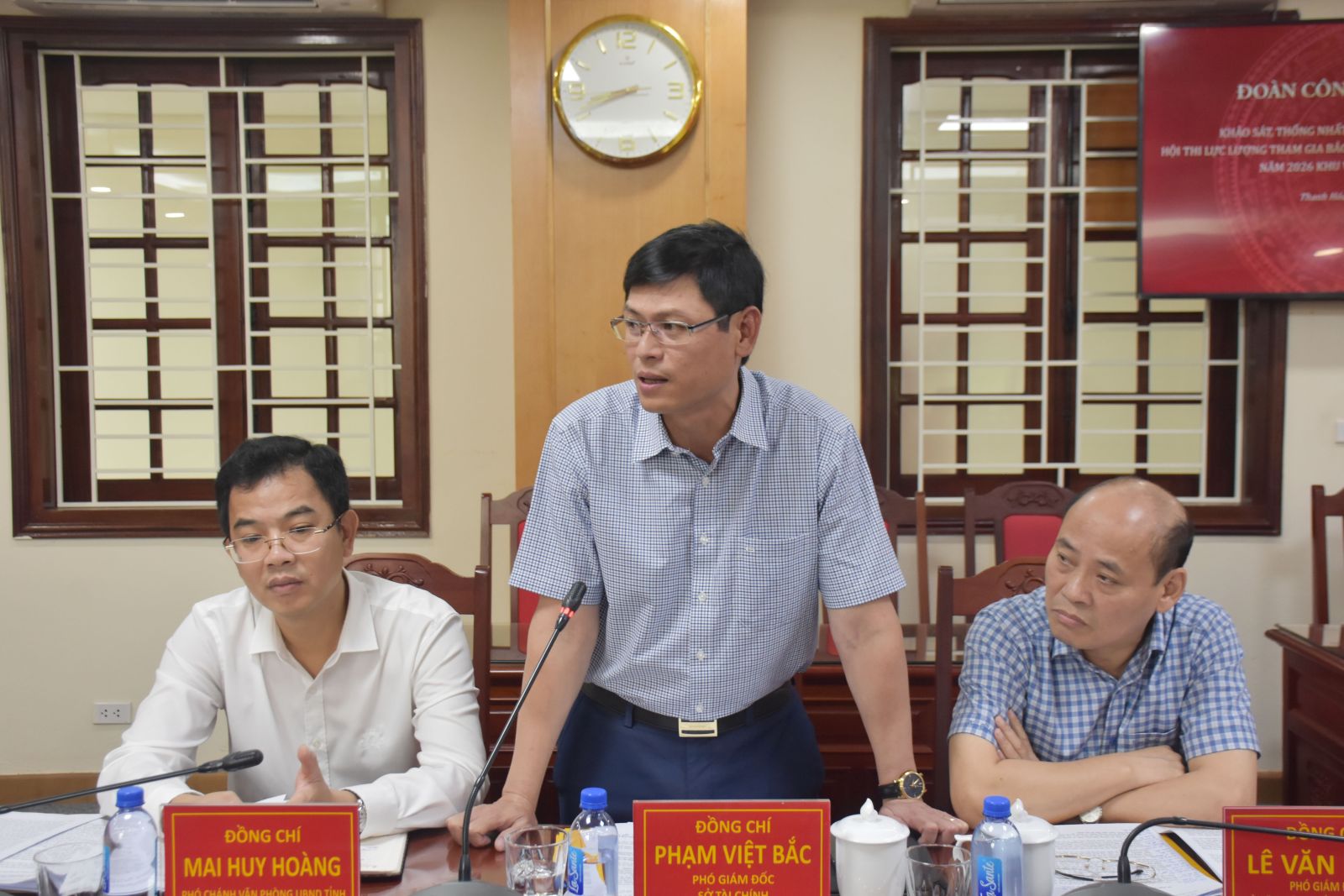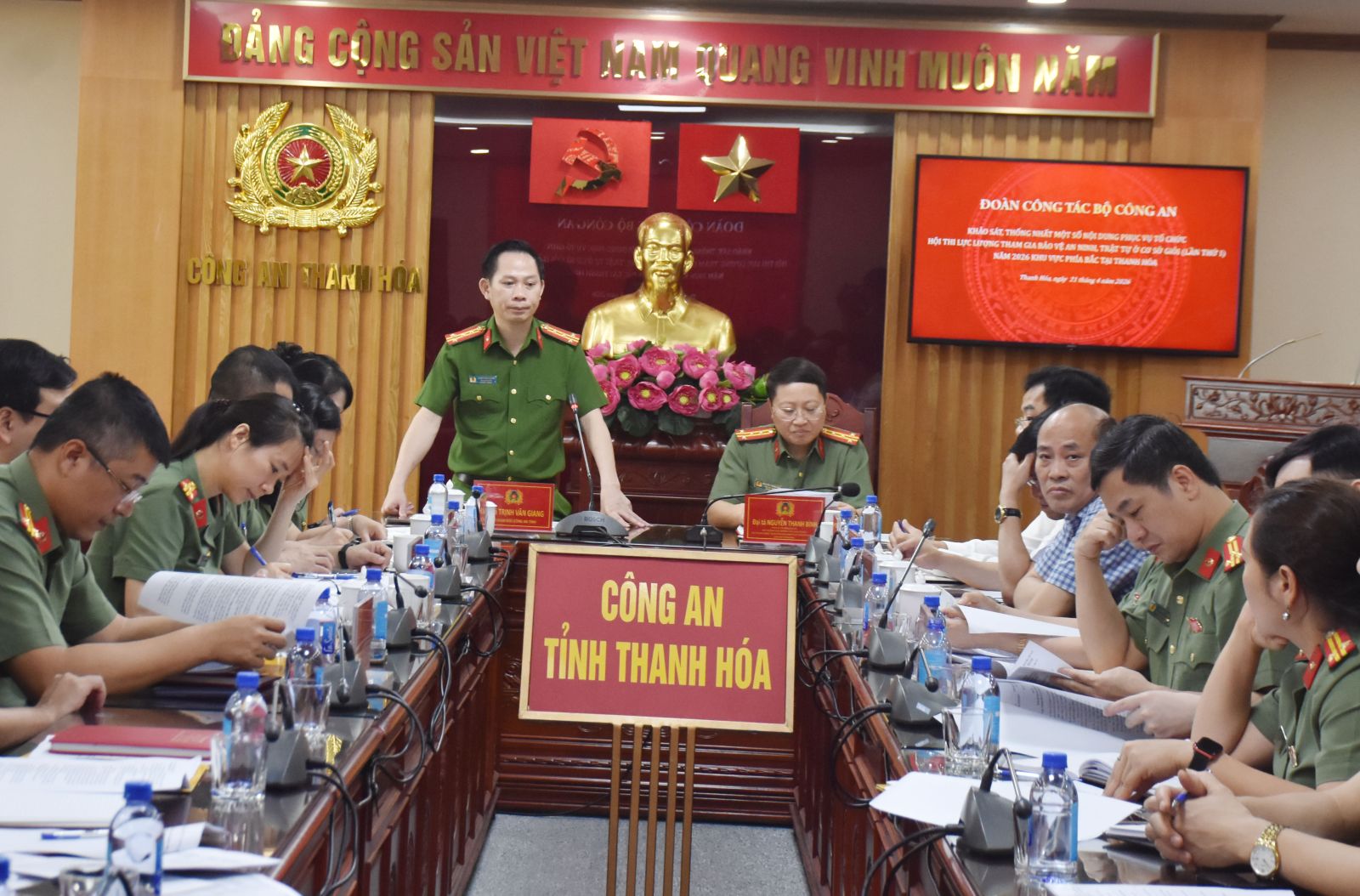 Phát biểu tại buổi làm việc, Đại tá Trịnh Văn Giang, Phó Giám đốc Công an tỉnh Thanh Hóa trân trọng cảm ơn sự quan tâm, chỉ đạo sát sao của Bộ Công an và Đoàn công tác. Đồng chí Phó Giám đốc Công an tỉnh khẳng định, việc Thanh Hoá được lựa chọn đăng cai tổ chức Hội thi khu vực phía Bắc là niềm vinh dự lớn, đồng thời cũng đặt ra trách nhiệm cao đối với lực lượng Công an. Trong thời gian tới, Công an tỉnh sẽ tiếp tục làm tốt công tác tham mưu cho UBND tỉnh, phối hợp chặt chẽ với các sở, ngành liên quan để chuẩn bị đầy đủ các điều kiện cần thiết, từ cơ sở vật chất, nhân lực đến các phương án bảo đảm an ninh, an toàn cho Hội thi.