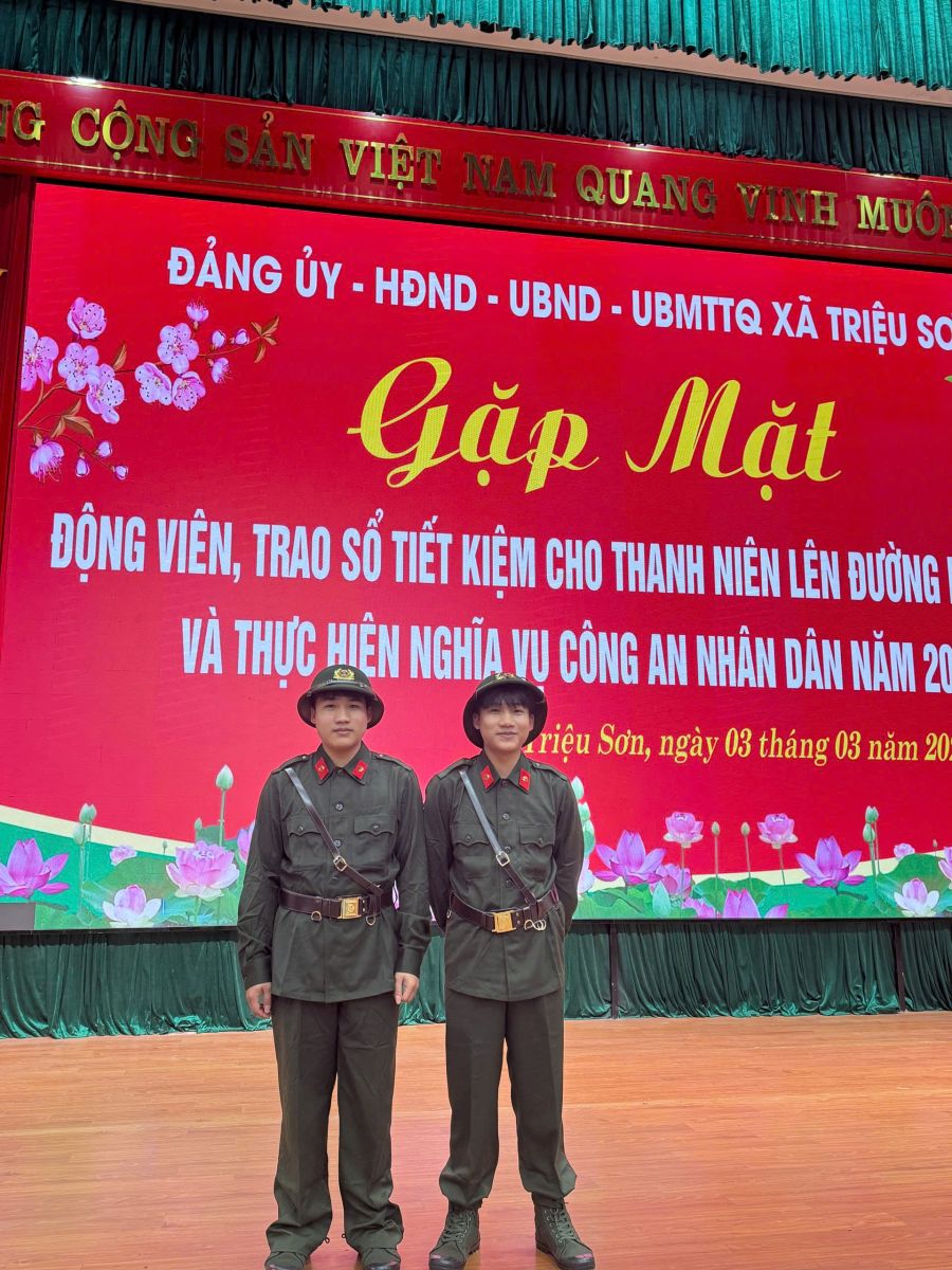Đặc biệt hơn, năm 2026 xã Triệu Sơn có 02 công dân được tuyển chọn thực hiện nghĩa vụ tham gia CAND là anh em sinh đôi đó là em Đặng Văn Quang và em Đặng Văn Vinh, sinh năm 2007. Mặc dù theo quy định của pháp luật, một trong hai anh em sinh đôi được tạm hoãn nghĩa vụ quân sự, nhưng nguyện vọng của Quang và Vinh được cha mẹ ủng hộ, động viên hai anh em vượt qua khó khăn, vất vả để hoàn thành tốt nhiệm vụ. Các em tâm sự: