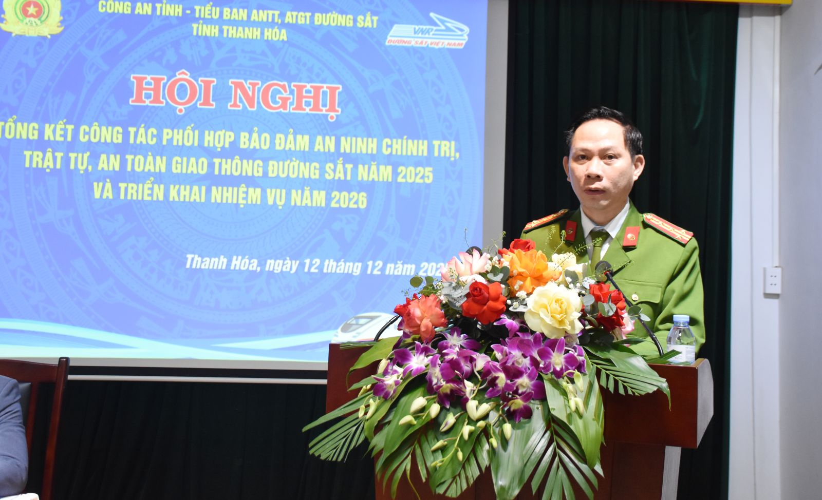 Chiều 12/12, Công an tỉnh Thanh Hóa và Tiểu ban An ninh, trật tự (ANTT), an toàn giao thông (ATGT) đường sắt tỉnh Thanh Hóa đã tổ chức Hội nghị tổng kết công tác phối hợp bảo đảm an ninh chính trị, trật tự ATGT đường sắt năm 2025 và triển khai nhiệm vụ năm 2026. Đại tá Trịnh Văn Giang, Phó Giám đốc Công an tỉnh và ông Hoàng Ngọc Tùng, Trưởng Tiểu ban An ninh, an toàn đường sắt khu vực tỉnh Thanh Hóa đồng chủ trì Hội nghị..