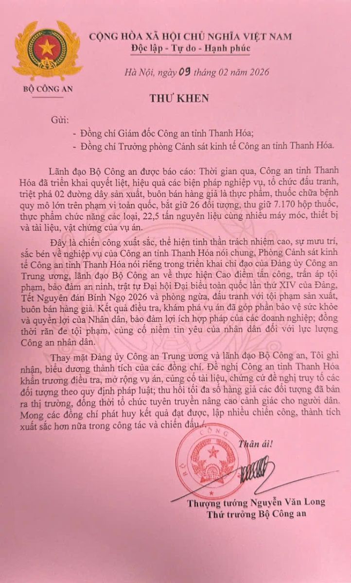 Ngày 09/2/2026, thay mặt Đảng ủy Công an Trung ương và lãnh đạo Bộ Công an, Thượng tướng Nguyễn Văn Long, Thứ trưởng Bộ Công an đã gửi Thư khen Công an tỉnh Thanh Hóa về thành tích xuất sắc trong đấu tranh, triệt phá các đường dây tội phạm sản xuất, buôn bán hàng giả là thực phẩm, thuốc chữa bệnh quy mô lớn trên phạm vi toàn quốc.