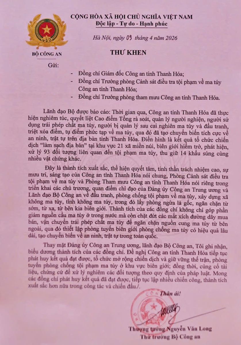 Ngày 09/4/2026, Đồng chí Thượng tướng Nguyễn Văn Long, Thứ trưởng Bộ Công an đã có thư khen gửi Công an tỉnh Thanh Hoá biểu dương thành tích đặc biệt xuất sắc trong trong triển khai, thực hiện cao điểm phòng, chống ma túy. Nổi bật là chiến dịch “làm sạch địa bàn” tại 21 xã miền núi, biên giới, qua đó phát hiện, xử lý 93 đối tượng, thu giữ 14 khẩu súng, góp phần quan trọng giữ vững an ninh, trật tự trên địa bàn…
