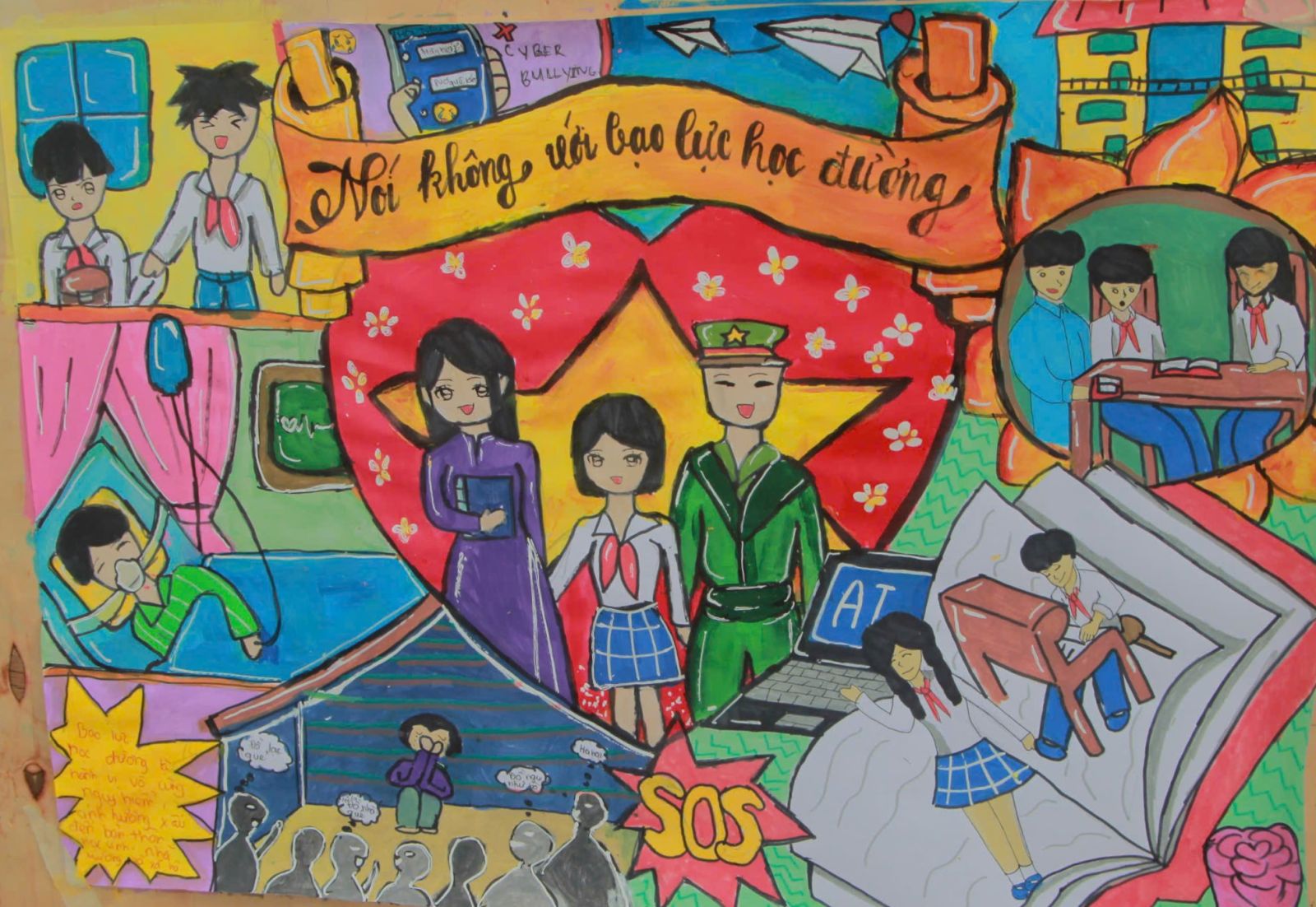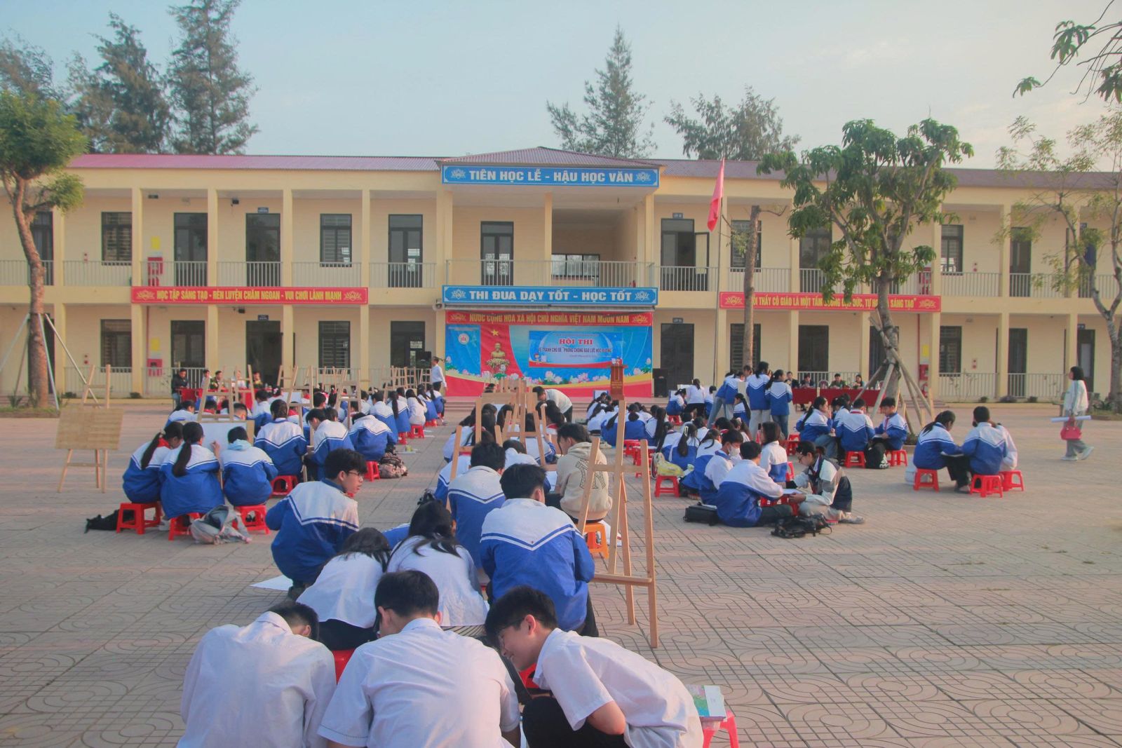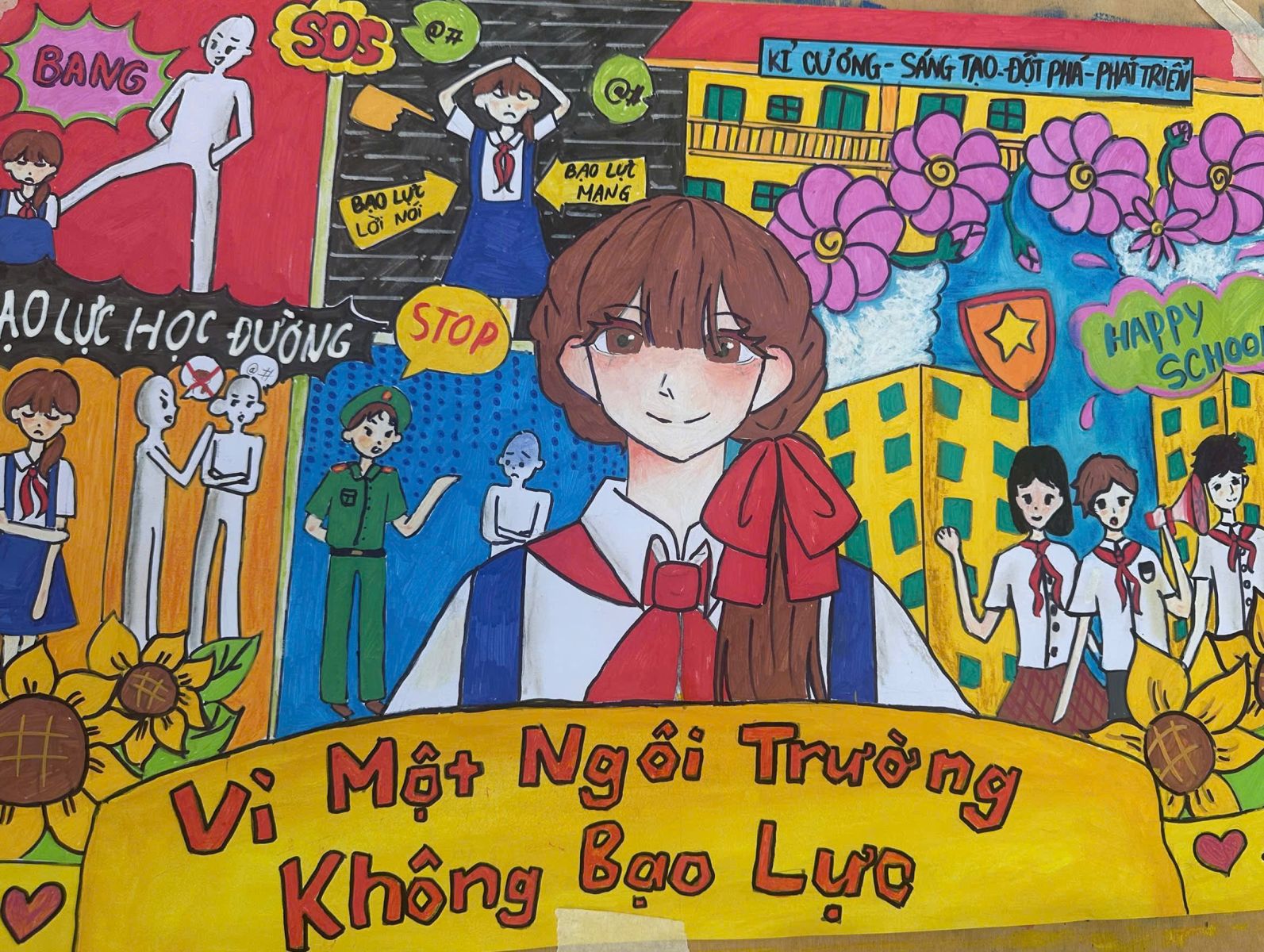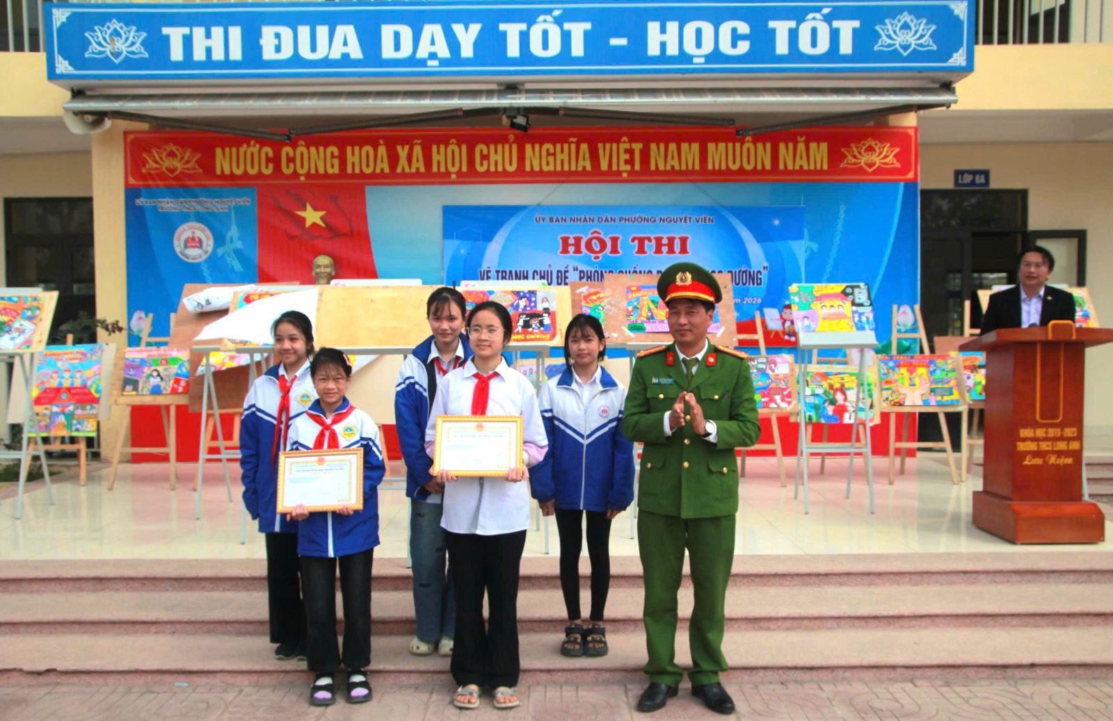 Thông qua hình thức hội họa, các em học sinh không chỉ thể hiện khả năng nghệ thuật mà còn gửi gắm những góc nhìn sắc sảo, đầy nhân văn về vấn nạn bạo lực học đường. Trong 120 phút sáng tạo miệt mài, những thông điệp về cách ứng xử và tình bạn trong sáng, hồn niên của lứa tuổi học trò đã được lan tỏa mạnh mẽ hơn bao giờ hết.