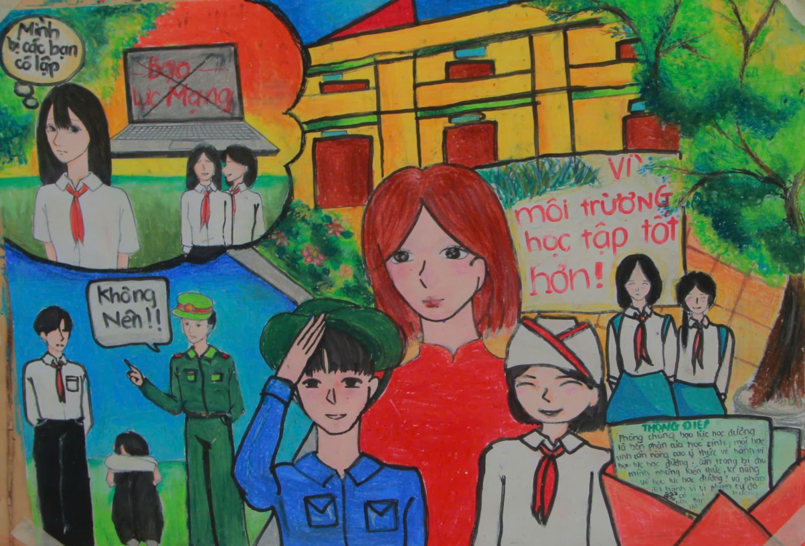 Nhiều tác phẩm dự thi đã phản ánh chân thực những hành vi bạo lực học đường cần được lên án, đồng thời truyền tải thông điệp tích cực về tình bạn, sự tôn trọng, tinh thần đoàn kết, sẻ chia và trách nhiệm của mỗi cá nhân trong xây dựng môi trường học đường an toàn, thân thiện. Qua từng nét vẽ, các em bày tỏ mong muốn được học tập trong không gian không có bạo lực, nơi các mâu thuẫn được giải quyết bằng đối thoại, cảm thông và tuân thủ pháp luật.