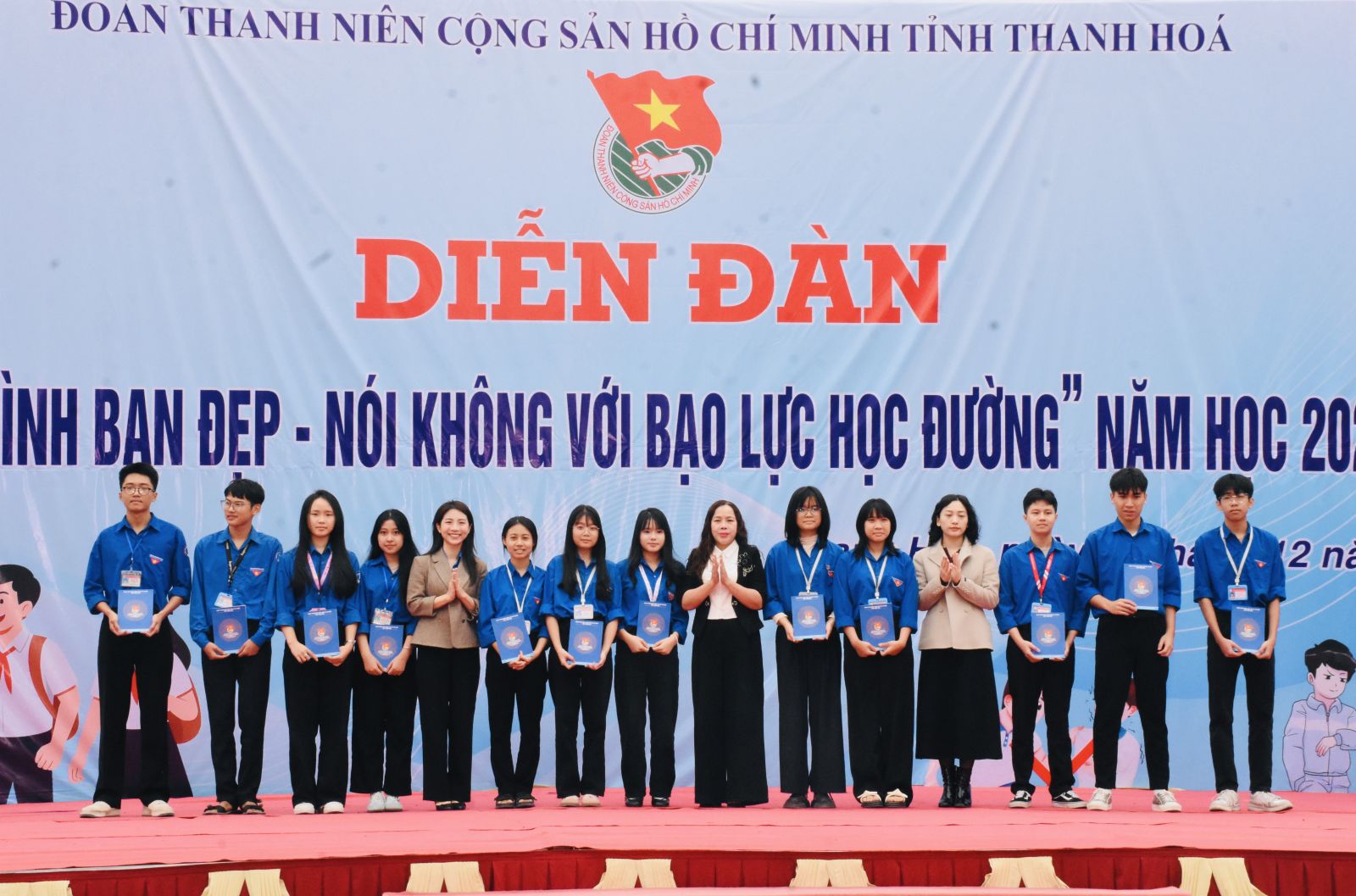 Đặc biệt, tại diễn đàn các đoàn viên, học sinh đã cùng hưởng ứng thông điệp “Xây dựng tình bạn đẹp - Nói không với bạo lực học đường” và thể hiện quyết tâm chung tay xây dựng tình bạn trong sáng, nói không với bạo lực bằng những cam kết cụ thể: trân trọng, đoàn kết, yêu thương và giúp đỡ lẫn nhau trong học tập, cuộc sống; chủ động lên tiếng trước những hành vi sai trái; tích cực tham gia giữ gìn môi trường học đường an toàn, thân thiện và đầy ắp yêu thương.