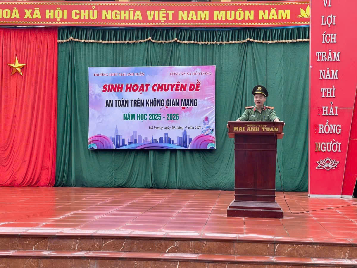 Nhằm trang bị cho các em học sinh những kiến thức, kỹ năng cần thiết để tự bảo vệ mình trước các nguy cơ trên không gian mạng, sáng 20/4/2026, Công an xã Hồ Vương phối hợp Trường THPT Mai Anh Tuấn tổ chức buổi tuyên truyền chuyên đề “An toàn trên không gian mạng”.