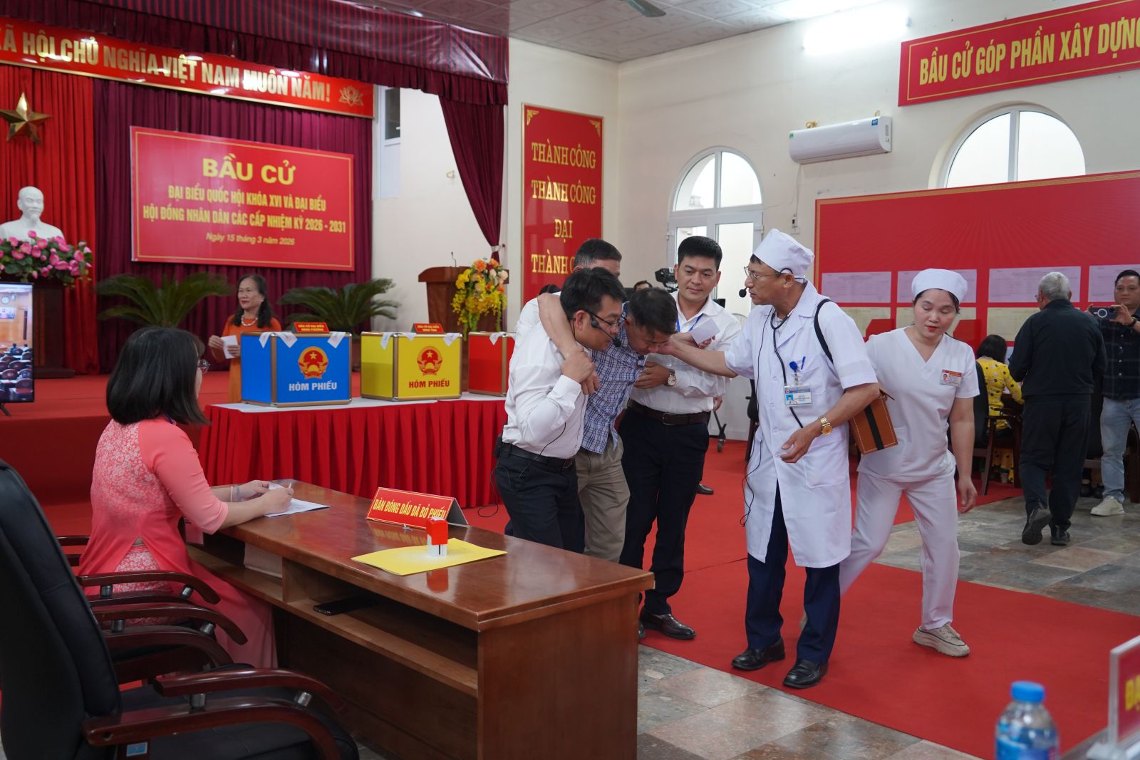 Tình huống diễn tập hỗ trợ sức khỏe cho cử tri trong khu vực bỏ phiếu.