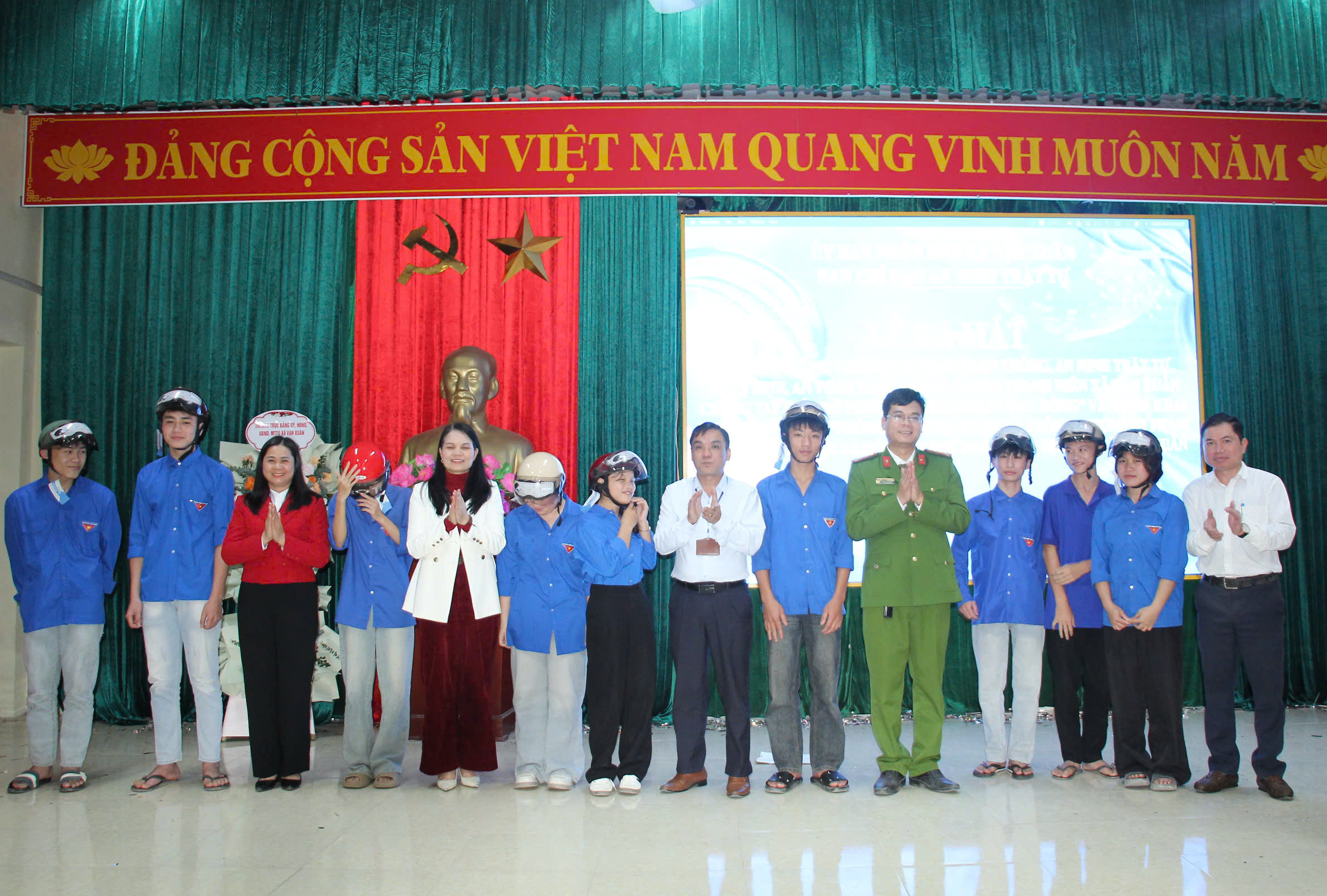 Các đại biểu trao tặng mũ bảo hiểm cho các đoàn viên, thanh niên tham gia mô hình
