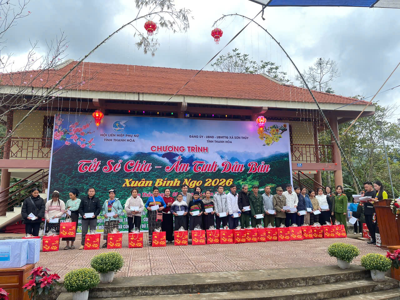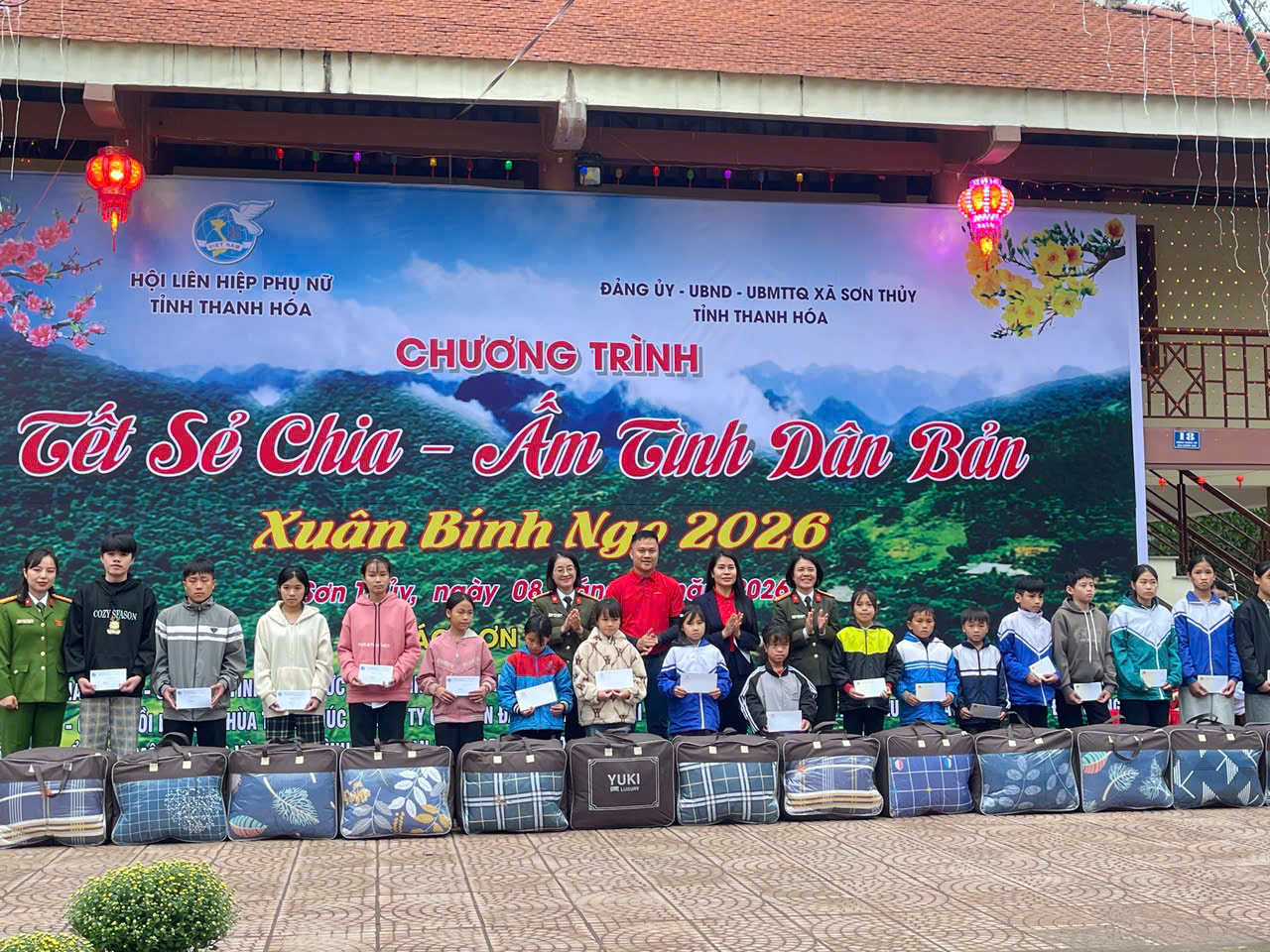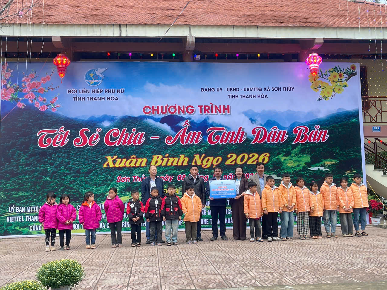Cũng trong dịp này, tại bản Chung Sơn, Hội LHPN tỉnh phối hợp với xã Sơn Thuỷ và các đơn vị đồng hành tổ chức Chương trình “Tết sẻ chia – Ấm tình dân bản” Xuân Bính Ngọ 2026. Trong không khí ấm áp những ngày giáp Tết, chương trình đã diễn ra với nhiều hoạt động thiết thực, ý nghĩa, như: trao 2 mô hình sinh kế cho hội viên, phụ nữ xã Sơn Thủy và xã Tam Thanh trị giá 100 triệu đồng; trao biển biểu trưng 100 suất quà cho 5 xã: Sơn Điện, Tam Lư, Trung Hạ, Sơn Điện, Mường Mìn; tặng trang thiết bị dạy học, 200 chiếc áo ấm cho học sinh xã Sơn Thuỷ; tặng hàng trăm suất quà cho hội viên, phụ nữ và trẻ em có hoàn cảnh khó khăn các xã Sơn Thủy, Na Mèo, Mường Mìn, gia đình có công với cách mạng và người có uy tín trong cộng đồng, giáo viên, cán bộ, công chức, các cơ quan đơn vị trên địa bàn xã.