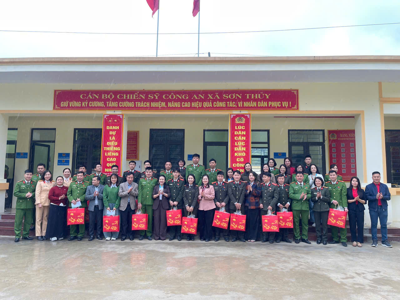 Sơn Thủy là xã vùng cao, biên giới với địa hình hiểm trở, khí hậu khắc nghiệt, nơi điều kiện sinh hoạt và làm việc của cán bộ, chiến sĩ Công an xã vẫn còn nhiều thiếu thốn. Thấu hiểu những vất vả thầm lặng đó, Đoàn công tác đã trực tiếp thăm hỏi và trao tặng 56 suất quà (mỗi suất trị giá 1 triệu đồng) cho 23 đồng chí Công an xã Sơn Thuỷ và 33 đồng chí là lực lượng tham gia bảo vệ ANTT ở cơ sở.