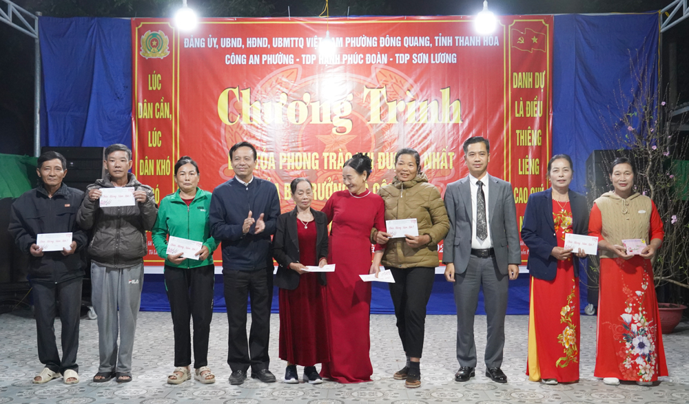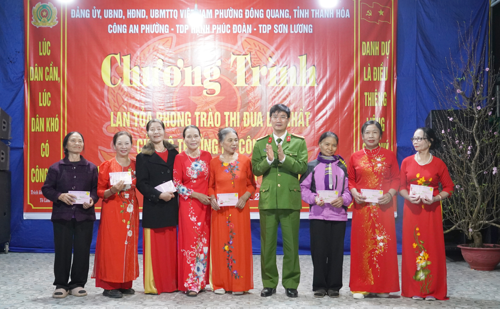 Phát huy vai trò nòng cốt trong giữ gìn an ninh trật tự (ANTT) tại cơ sở, tối 12/02/2026, Công an phường Đông Quang đã tổ chức chương trình hưởng ứng phong trào thi đua "Ba nhất", gắn liền với các hoạt động an sinh xã hội thiết thực. Tham dự chương trình có đại diện cấp uỷ, chính quyền địa phương, một số doanh nghiệp đồng hành trên địa bàn cùng đông đảo Nhân dân Tổ dân phố Hạnh Phúc Đoàn và Tổ dân phố Sơn Lương, phường Đông Quang.