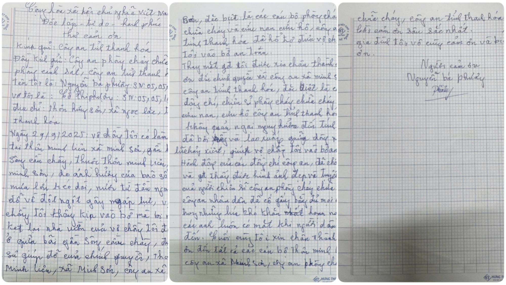 Trong Thư, ông bà bày tỏ sự xúc động, biết ơn sâu sắc trước tinh thần dũng cảm, hành động kịp thời, tận tâm và trách nhiệm của các chiến sĩ PCCC và CNCH Công an tỉnh Thanh Hoá. “Ngày 29/9/2025, vợ chồng chúng tôi có làm vườn trong nhà vườn của gia đình tại thôn Minh Liên, xã Minh Sơn ở bãi giữa gần sông Cầu Chày. Do ảnh hưởng của bão số 10, mưa lớn kéo dài, nước từ đầu nguồn đổ về đột ngột gây ngập lụt, vợ chồng tôi không kịp vào bờ mà bị mắc kẹt lại nhà vườn. Được sự giúp đỡ của chính quyền, Công an xã Minh Sơn và đặc biệt là lực lượng Cảnh sát PCCC và CNCH Công an tỉnh đã hỗ trợ đưa vợ chồng tôi vào bờ an toàn… Hành động của các đồng chí Công an đã cho tôi và gia đình thấy được hình ảnh đẹp tuyệt vời của người chiến sĩ Công an PCCC và CNCH đã cố gắng bằng đủ mọi cách trong những lúc khó khăn, hoạn nạn, các anh luôn có mặt khi người dân cần đến”- ông Phương xúc động viết