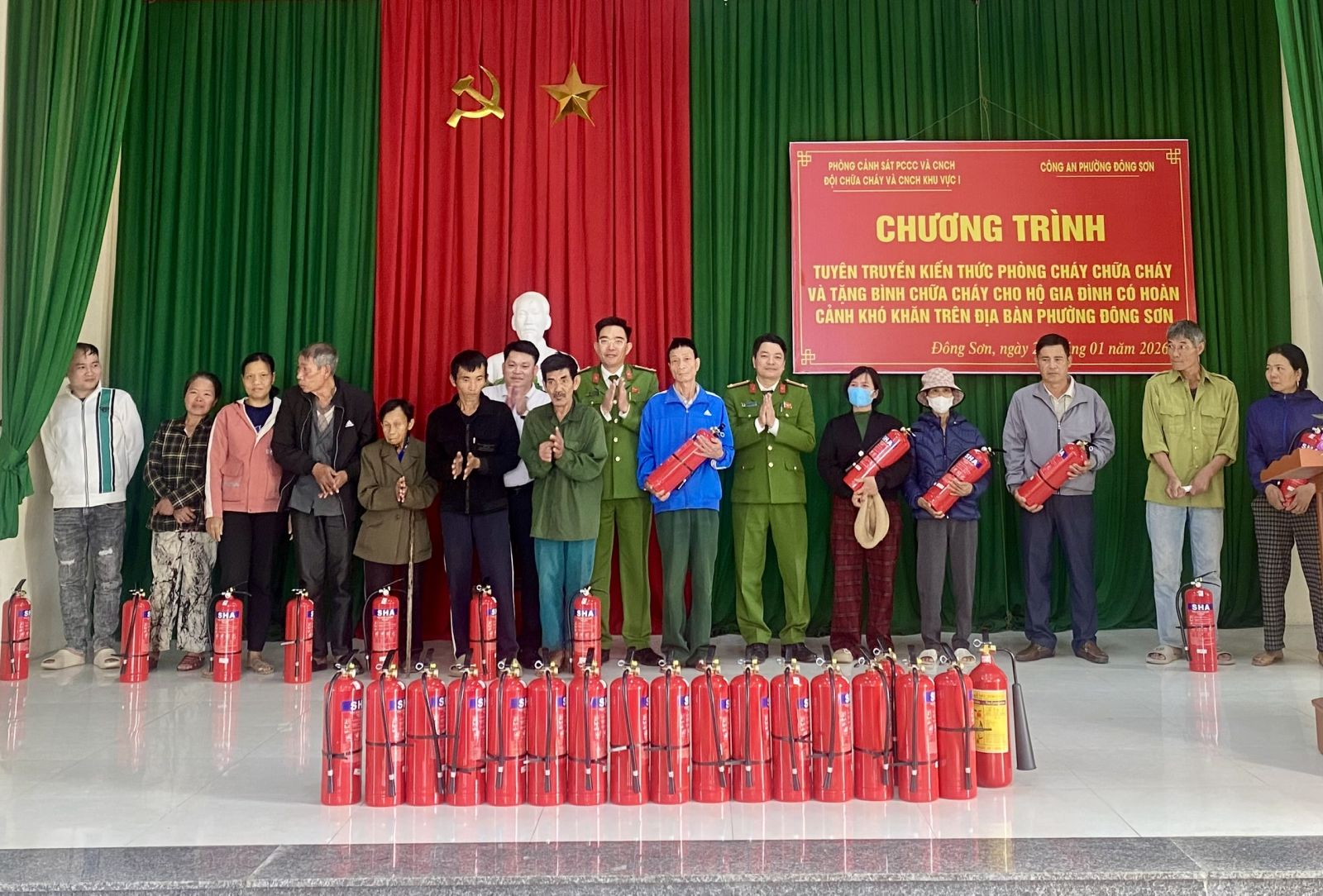 Nhân dịp này, Phòng Cảnh sát PCCC và CNCH, Công an phường Đông Sơn, Công ty TNHH Vận tải và Thương mại Thực Hằng đã trao tặng các bình chữa cháy cho 30 hộ gia đình có hoàn cảnh khó khăn trên địa bàn. Đây là hoạt động thiết thực, thể hiện tinh thần trách nhiệm, sự chung tay của lực lượng Công an và doanh nghiệp trong công tác bảo đảm an toàn PCCC, bảo vệ tính mạng và tài sản của Nhân dân.