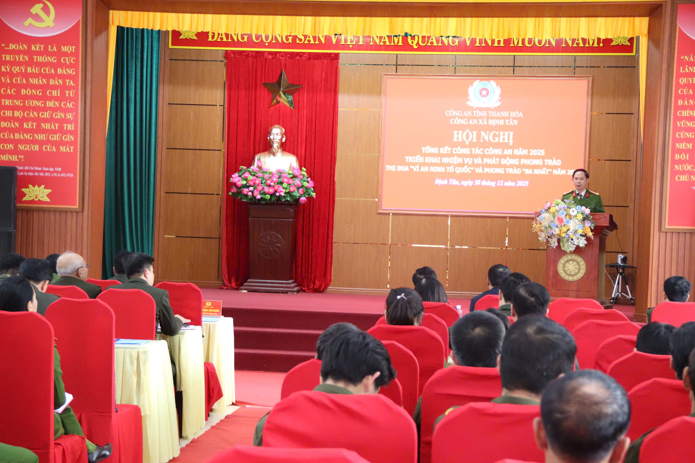 Chiều 30/12, Công an xã Định Tân đã tổ chức Hội nghị tổng kết công tác Công an năm 2025; triển khai nhiệm vụ và phát động phong trào thi đua “Vì an ninh Tổ quốc” năm 2026 gắn với phong trào thi đua “Ba nhất”. Dự và chỉ đạo Hội nghị có đồng chí Đại tá Trịnh Văn Giang, Phó Giám đốc Công an tỉnh; đại diện lãnh đạo các phòng chức năng Công an tỉnh, cùng đại diện lãnh đạo cấp ủy, chính quyền địa phương và tập thể chỉ huy, cán bộ, chiến sĩ Công an xã Định Tân. ...