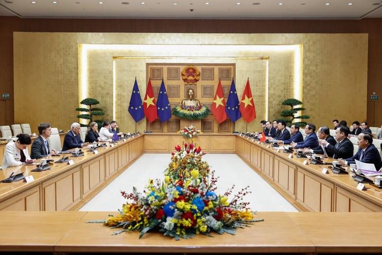 Thủ tướng Chính phủ khẳng định Việt Nam coi trọng vai trò và vị thế toàn cầu của EU, mong muốn tăng cường quan hệ với EU - một trong những đối tác hàng đầu của Việt Nam về kinh tế, thương mại và đầu tư và tiên phong trong việc thúc đẩy phát triển bền vững, tăng trưởng xanh, kinh tế tuần hoàn, chuyển đổi số, năng lượng sạch và thương mại tự do.