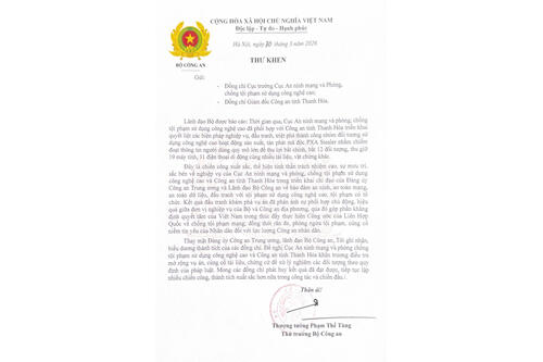 Ngày 30/3/2026, Thượng tướng Phạm Thế Tùng, Ủy viên Trung ương Đảng, Thứ trưởng Bộ Công an đã có thư khen gửi Công an tỉnh Thanh Hóa biểu dương thành tích trong đấu tranh, triệt phá nhóm đối tượng sử dụng công nghệ cao hoạt động sản xuất, tán phát ...