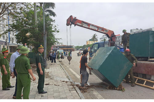 Cán bộ Công an giúp Nhân dân thu dọn gỗ dăm bị đổ trên đường -