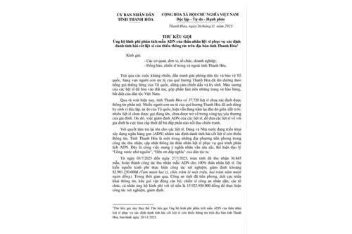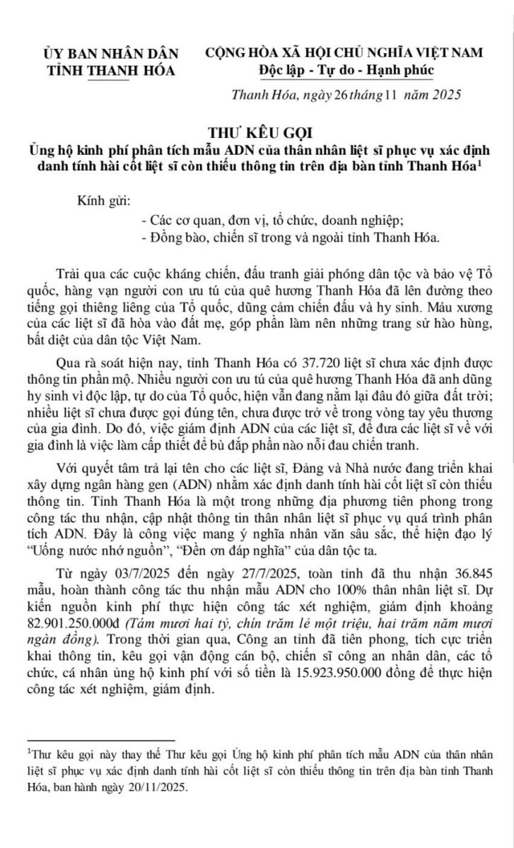 Ngày 26/11/2025, Chủ tịch UBND tỉnh Thanh Hóa Nguyễn Hoài Anh có Thư kêu gọi các cơ quan, đơn vị, tổ chức, doanh nghiệp; đồng bào, chiến sĩ trong và ngoài tỉnh tham gia ủng hộ kinh phí phân tích mẫu ADN của thân nhân liệt sĩ để phục vụ xác định danh ... -
