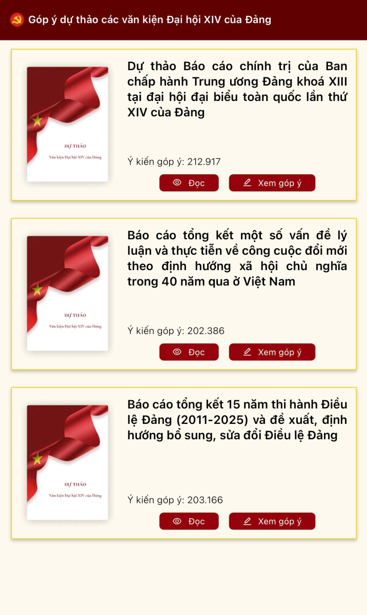 👉Bước 2: Tại màn hình ứng dụng, ấn “Gửi góp ý” dự thảo các văn kiện Đại hội XIV của Đảng.