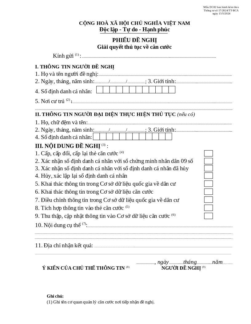 Thành phần hồ sơ | Phiếu đề nghị giải quyết thủ tục về căn cước (Mẫu DC02 ban hành kèm theo Thông tư số 17/2024/TT-BCA ngày 15/5/2024 của Bộ Công an); | |