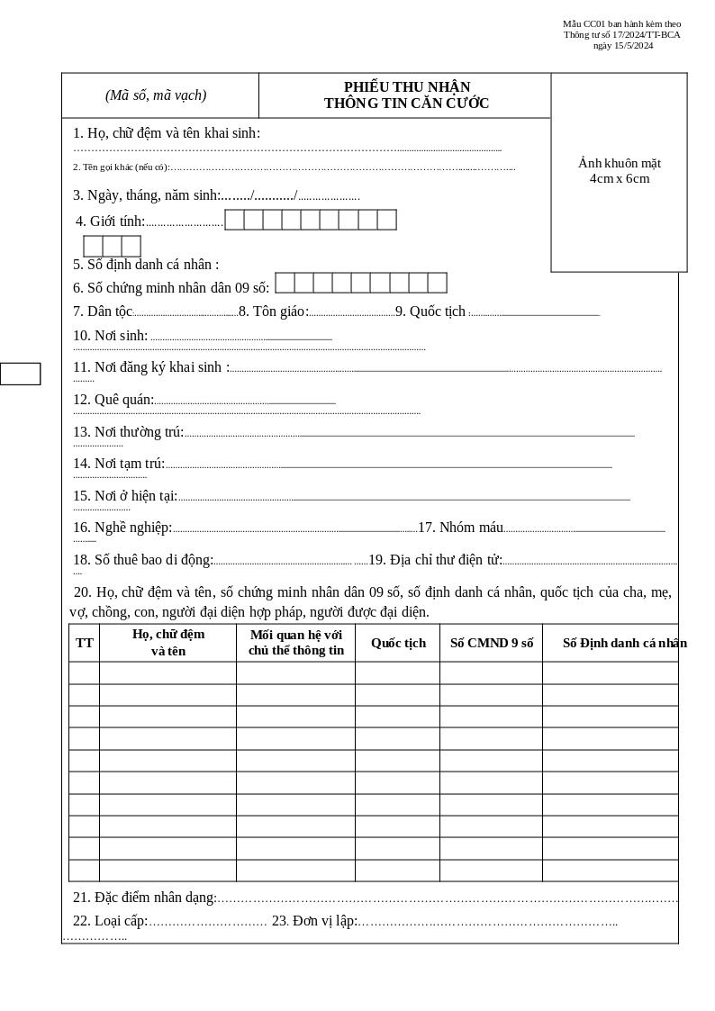 Thành phần hồ sơ | - Phiếu thu nhận thông tin căn cước (Mẫu CC01 ban hành kèm theo Thông tư số 17/2024/TT-BCA ngày 15/5/2024 của Bộ Công an); Phiếu được tạo lập khi trích xuất thông tin của người gốc Việt Nam chưa xác định được quốc tịch trong Cơ sở dữ liệu quốc gia về dân cư và in trong quá trình thu nhận hồ sơ căn cước để người đó kiểm tra và ký xác nhận. - Phiếu thu thập thông tin dân cư (Mẫu DC01 ban hành kèm theo Thông tư số 53/2025/TT-BCA ngày 01/7/2025 của Bộ Công an); | |