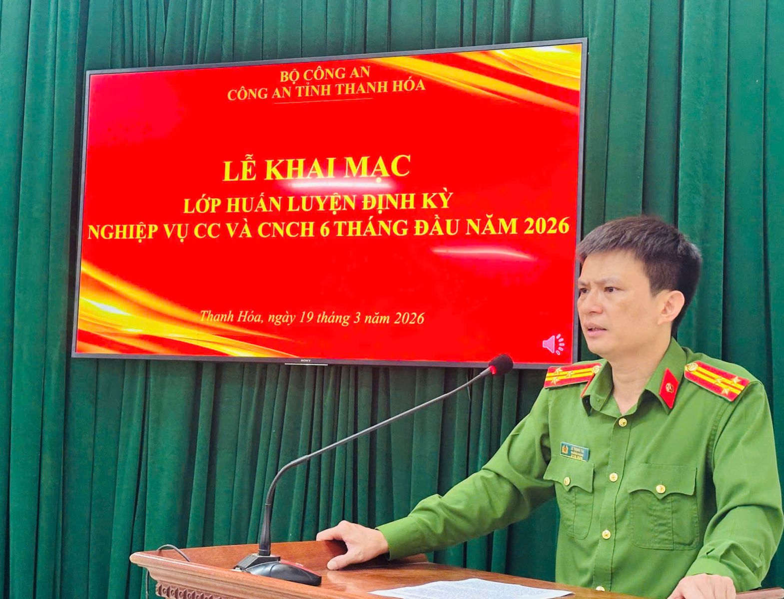Ngày 19/3/2026 tại Hội trường Phòng Cảnh sát PCCC và CNCH, Công an tỉnh Thanh Hóa tổ chức lễ khai giảng lớp huấn luyện, kiểm tra nghiệp vụ chữa cháy và cứu nạn, cứu hộ định kỳ 06 tháng đầu năm 2026. Tham dự và chỉ đạo lễ khai giảng có đồng chí Thượng tá Lê Trọng Tài - Trưởng Phòng Cảnh sát phòng cháy, chữa cháy và cứu nạn, cứu hộ; các đồng chí lãnh đạo, chỉ huy Phòng Cảnh sát PCCC và CNCH và các cán bộ, chiến sĩ tham gia lớp huấn luyện.