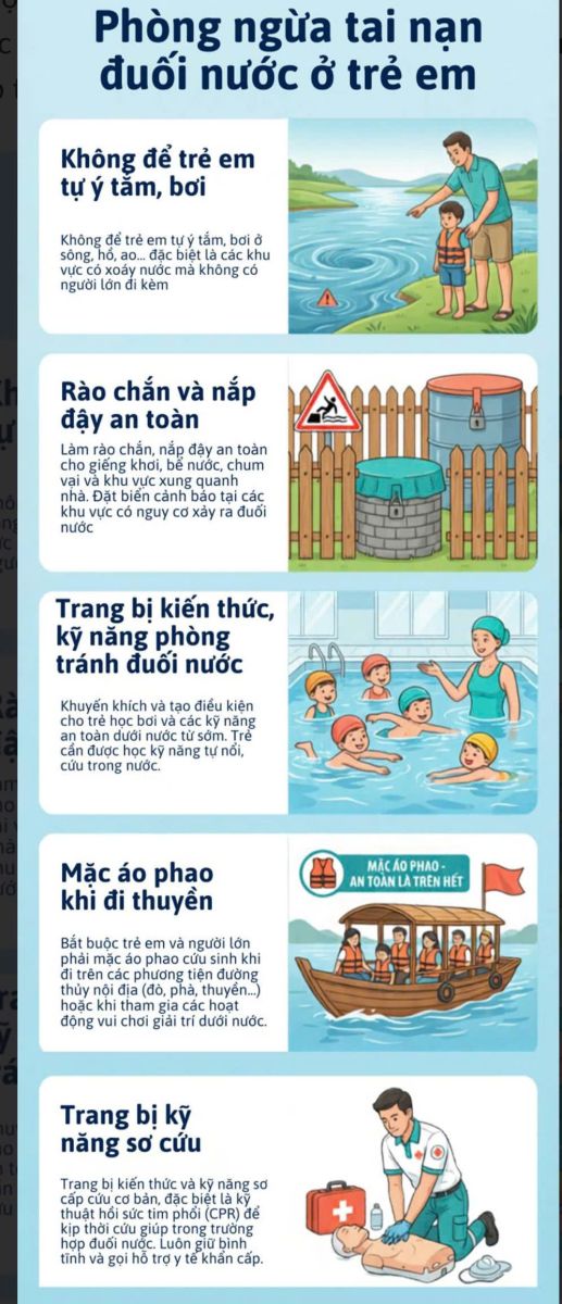 Không để trẻ em tự ý tắm, bơi ở sông, hồ, ao… đặc biệt là tại các khu vực nước sâu, chảy xiết, có xoáy nước mà không có người lớn đi kèm – người đi cùng cần biết bơi và có kỹ năng cứu hộ cơ bản. Làm rào chắn quanh ao, hồ nước, rãnh nước gần nhà nơi trẻ dễ tiếp cận và có nguy cơ bị đuối nước. Đặt biển cảnh báo ở những nơi có nguy cơ gây đuối nước (hồ, ao, mương, máng, sông, ngòi, vùng nước xoáy…). Sử dụng nắp đậy bằng vật liệu cứng, an toàn cho bể nước, giếng khơi, dụng cụ chứa nước (lu nước, thùng nước, chậu nước, bồn tắm,…).Tuyệt đối không cho trẻ vui chơi gần ao, hồ, bể nước, giếng, công trình đang thi công có chứa nước hoặc khu vực nguy hiểm mà không có rào chắn, biển cảnh báo. Trang bị kiến thức và kỹ năng phòng tránh đuối nước cho trẻ ngay từ sớm. Khuyến khích phụ huynh cho con em mình tham gia các lớp học bơi tại các cơ sở uy tín, có giáo viên hướng dẫn chuyên nghiệp. Trẻ cần được học kỹ năng tự nổi, tự cứu trong nước và cách xử lý khi gặp tình huống nguy hiểm. Luôn tuân thủ nguyên tắc an toàn khi lên, xuống các phương tiện giao thông đường thủy (đò, tàu, thuyền, ghe,…) theo hướng dẫn của chủ phương tiện hoặc bảng chỉ dẫn tại bến. Luôn ghi nhớ khi lên phương tiện giao thông đường thủy phải mặc áo phao và quan sát vị trí các thiết bị cứu sinh để chủ động sử dụng khi không may gặp sự cố. Người lớn cũng cần được tập huấn các kỹ năng sơ cấp cứu cơ bản, đặc biệt là cấp cứu đuối nước, để có thể hỗ trợ kịp thời khi xảy ra tai nạn.