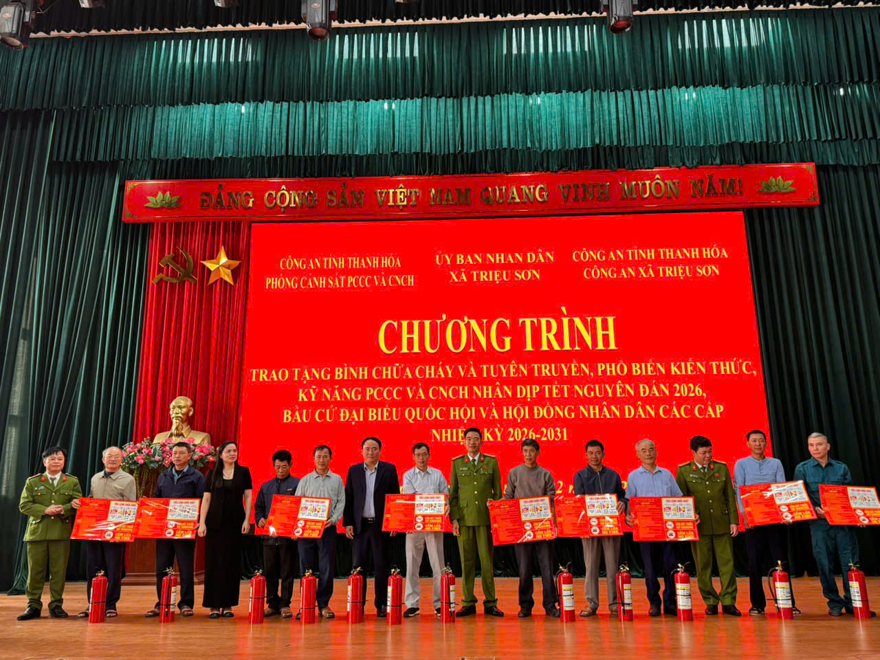 Sáng 13/02/2026, Phòng Cảnh sát PCCC và CNCH Công an tỉnh phối hợp với UBND và Công an xã Triệu Sơn tổ chức chương trình trao tặng bình chữa cháy và tuyên truyền, phổ biến kiến thức, kỹ PCCC và CNCH nhằm bảo đảm an toàn trong dịp Tết Nguyên đán Bính Ngọ và phục vụ bầu cử đại biểu Quốc hội, đại biểu Hội đồng nhân dân các cấp nhiệm kỳ 2026 - 2031.