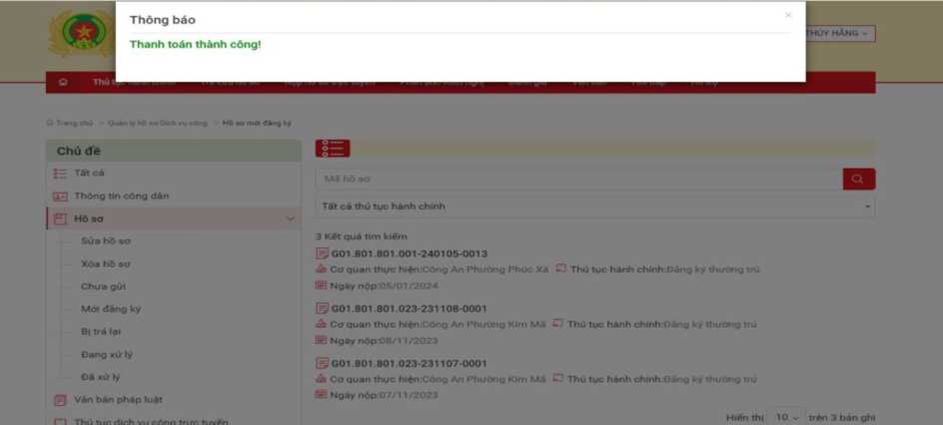 + Sau khi thanh toán thành công, hệ thống hiển thị thông báo như sau: