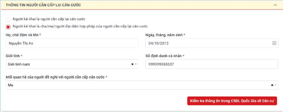 Trường hợp: Người kê khai là cha/ mẹ/ người đại diện hợp pháp của người cần cấp căn cước. Công dân nhập: