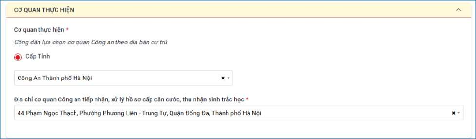 Công dân chọn cơ quan công an cấp Tỉnh/ Thành phố nơi cư trú và địa chỉ cơ quan nơi thu nhận sinh trắc học.