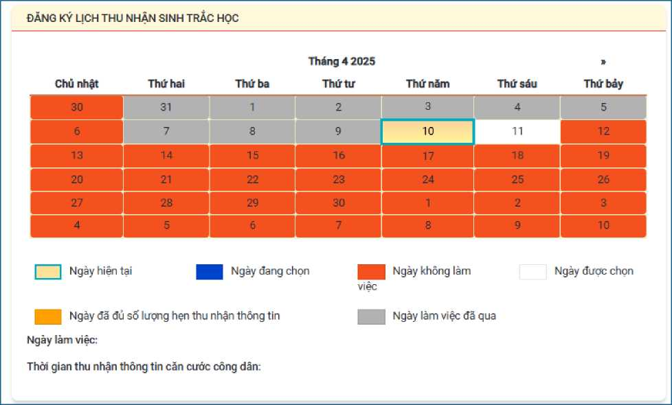 Trường hợp 1: Trường hợp công dân cần phải thu nhận sinh trắc học (do đến độ tuổi phải thu nhận sinh trắc học, thuộc độ tuổi phải cấp đổi căn cước hoặc quá độ tuổi cấp đổi mà chưa cấp đổi). Công dân lựa chọn ngày đặt lịch trên bảng lịch:
