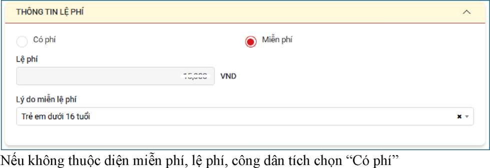 Nếu công dân thuộc diện miễn phí, lệ phí cấp căn cước thì tích chọn “Miễn phí” và lựa chọn lý do miễn phí.