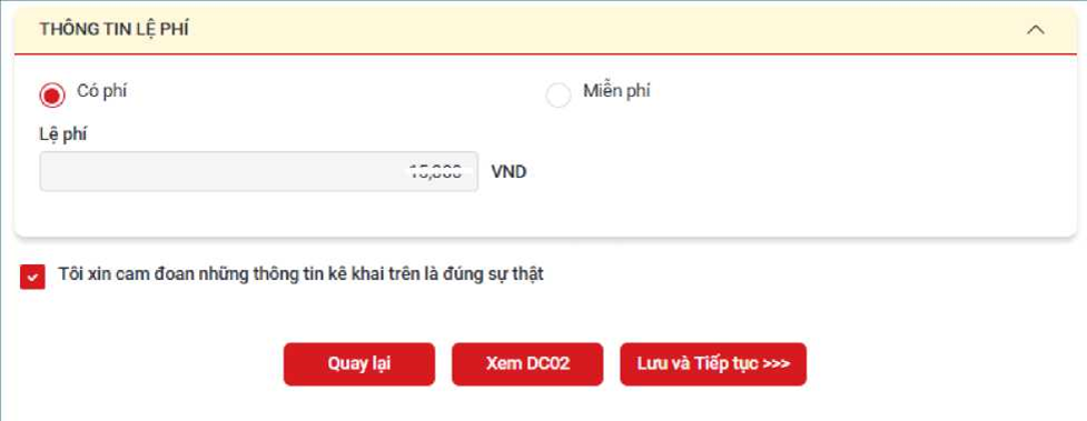* Công dân chọn [Lưu và thanh toán] để chuyển bước thanh toán trên nền tảng thanh toán của Vietcombank (với trường hợp có phí) hoặc chọn [Lưu và nộp hồ sơ] với trường hợp miễn phí hoặc không nộp lệ phí trực tuyến.