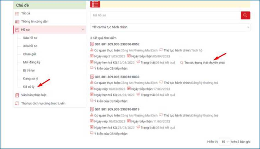 Bước 4: Công dân có thể tra cứu được trạng thái giao nhận hồ sơ bằng cách truy cập trang tra cứu của đơn vị cung cấp dịch vụ hoặc truy cập trang hồ sơ “Đã xử lý” lựa chọn nút [Tra cứu trạng thái chuyển phát] trên hồ sơ tương ứng:
