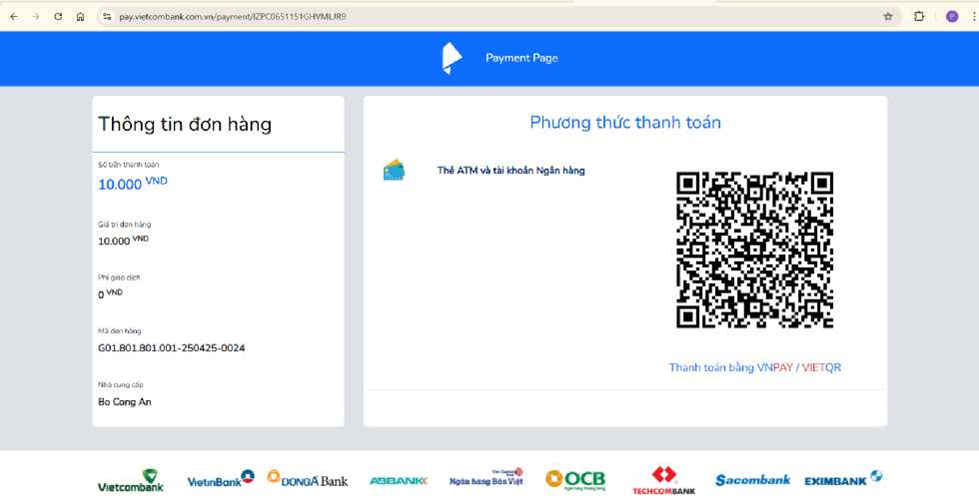 + Công dân lựa chọn phương thức thanh toán và thực hiện theo luồng yêu cầu của hệ thống.